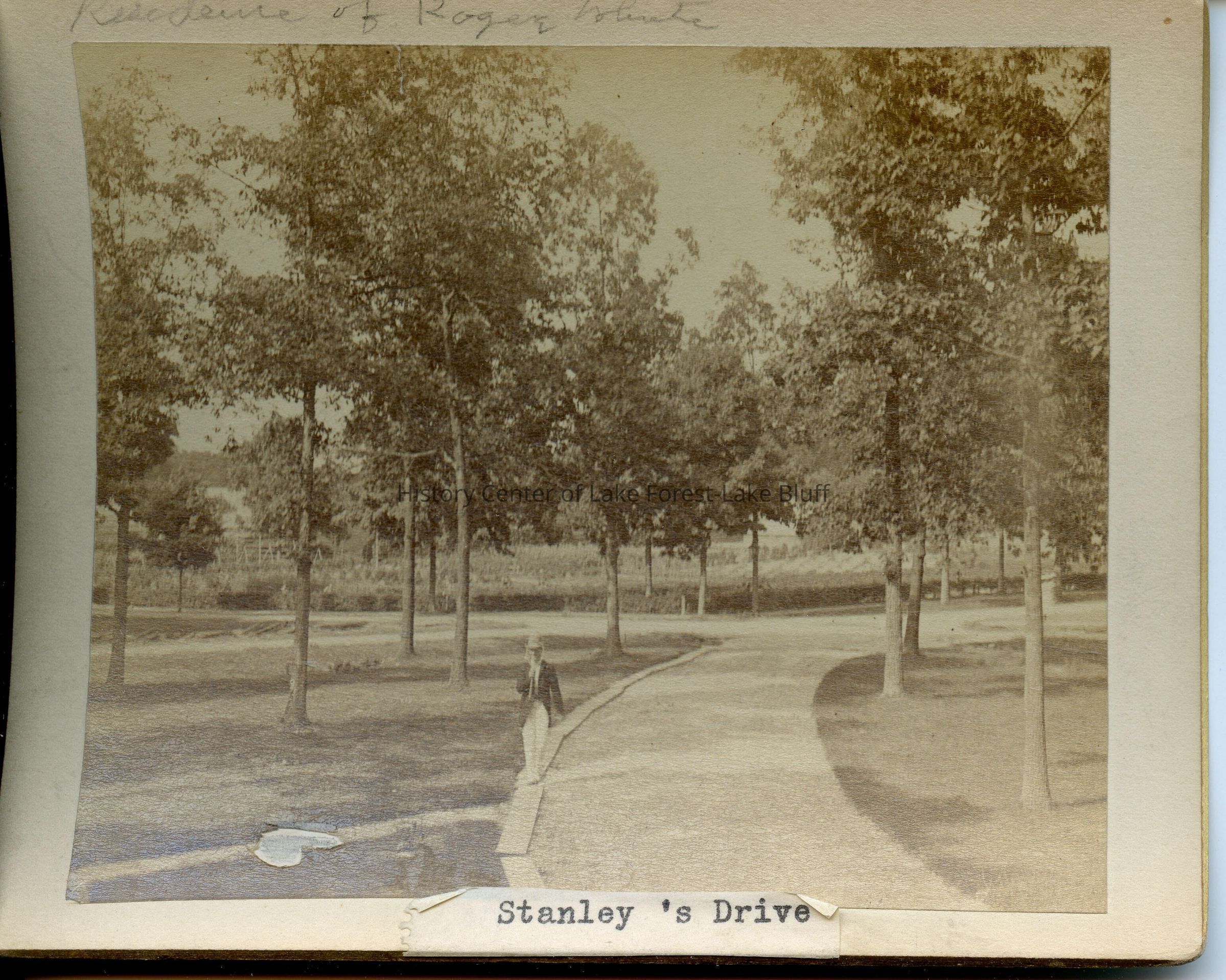 Sepia tone photograph labeled Stanley's Drive. "Residence of Roger White(?)" written on top edge. Man holding tennis racket on edge of drive. Small tear in photograph.
