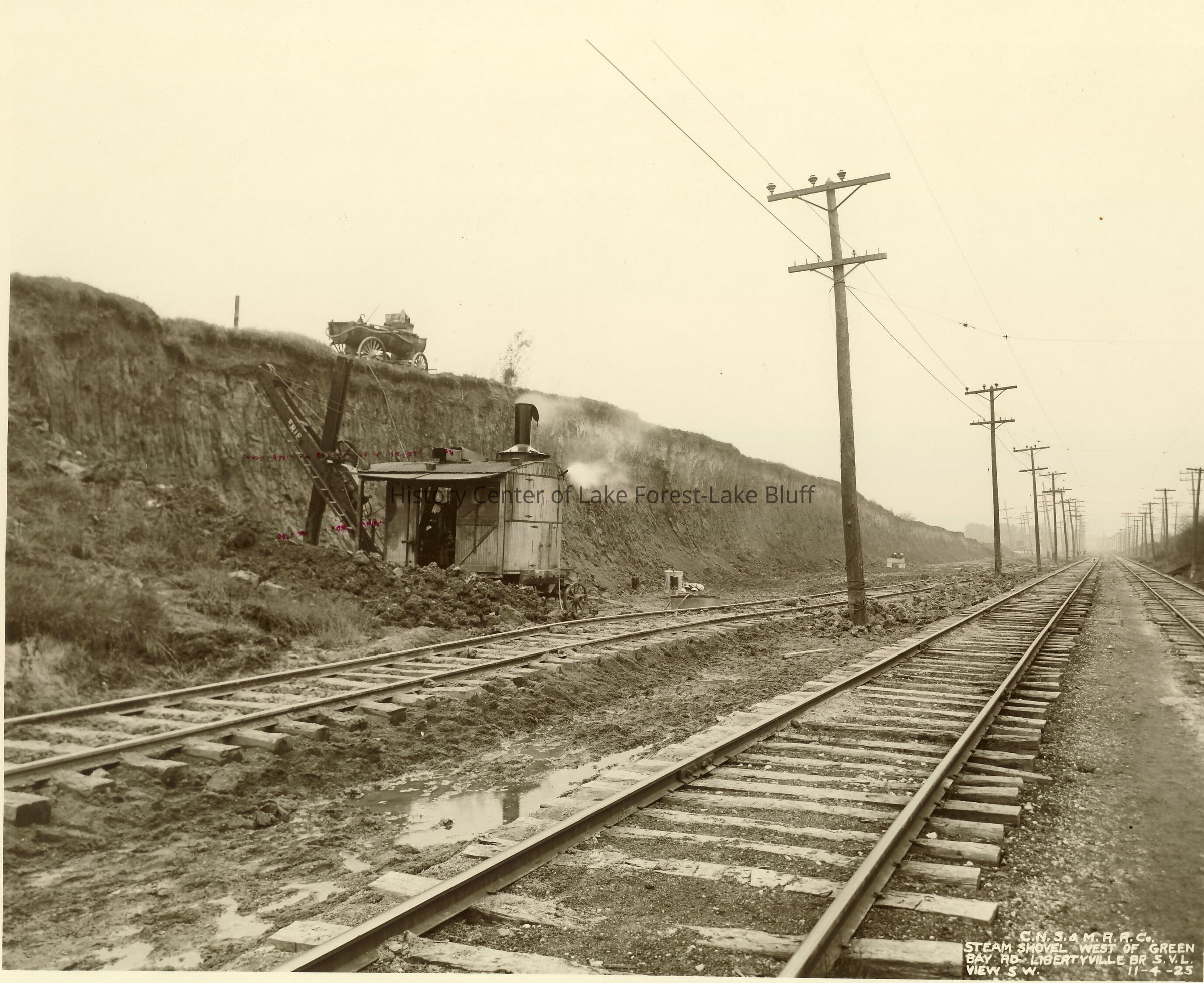 North Shore Line Skokie Valley Route Construction C.N.S. & M.R.R.C. Steam shovel. West of Green Bay Road, Libertyville B.R. S.V.L. view southwest November 4, 1925