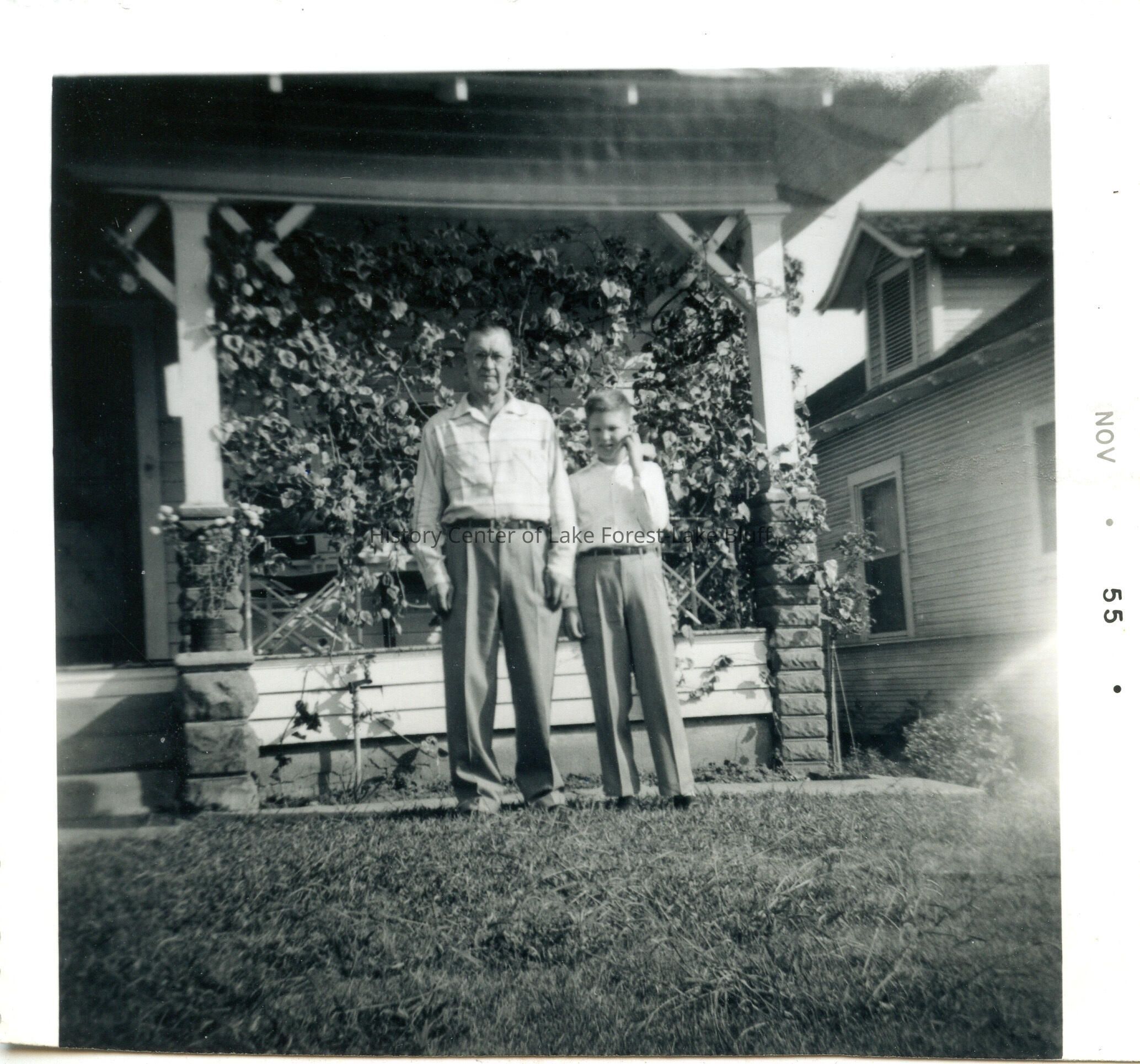 Stuart and Paul Steele in front of house with trelllis. Black and white. November 20, 1955.