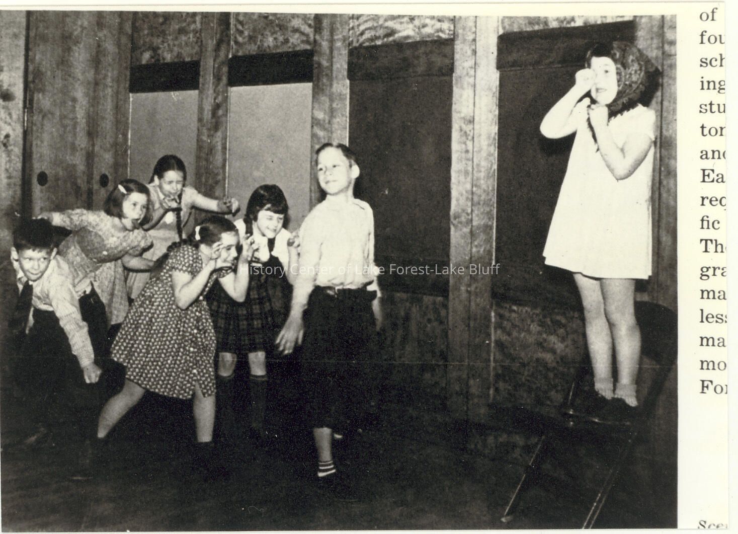 Students enacting a Speech play. Girl at right standing on chair.