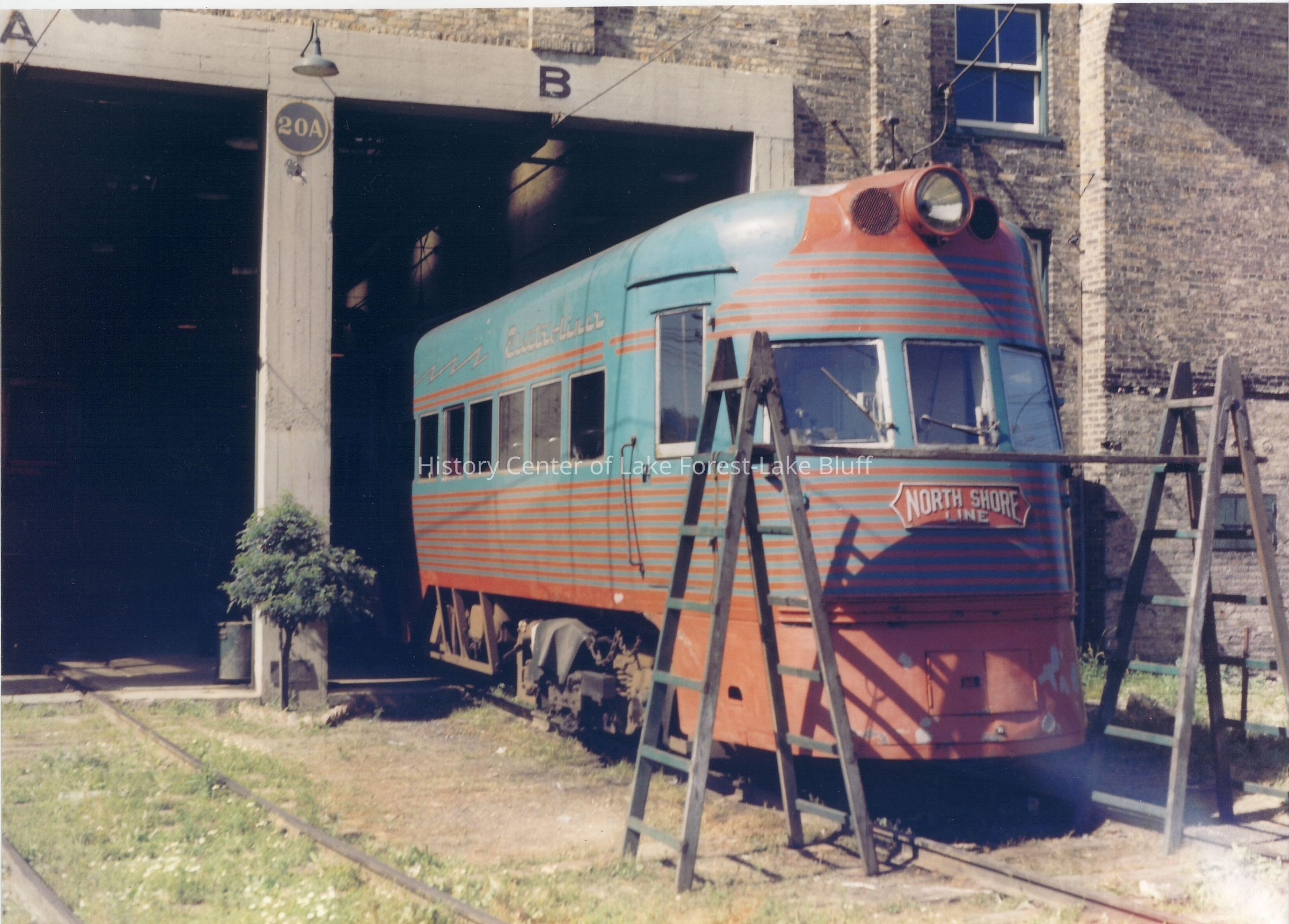 North Shore Line Electroliner train (801-802) in the Highwood Shops, Summer 1959
