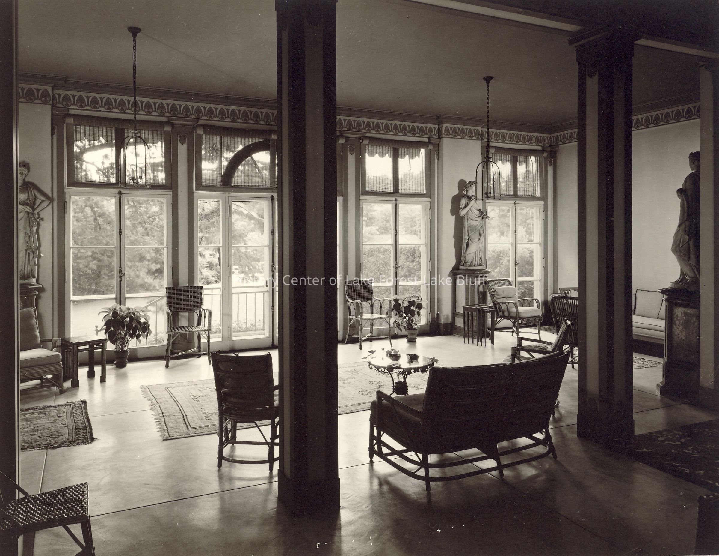 Sun room with three statues on pedestals and wall of windows facing garden.