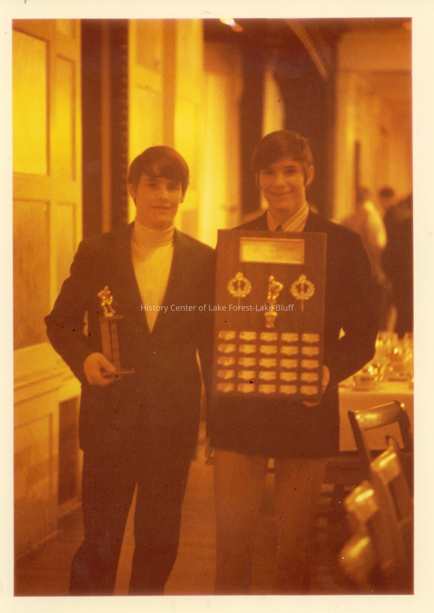 2 boys holding trophies- they are dressed in slacks and jackets, one of the boys is wearing a shirt and tie the other a turtleneck