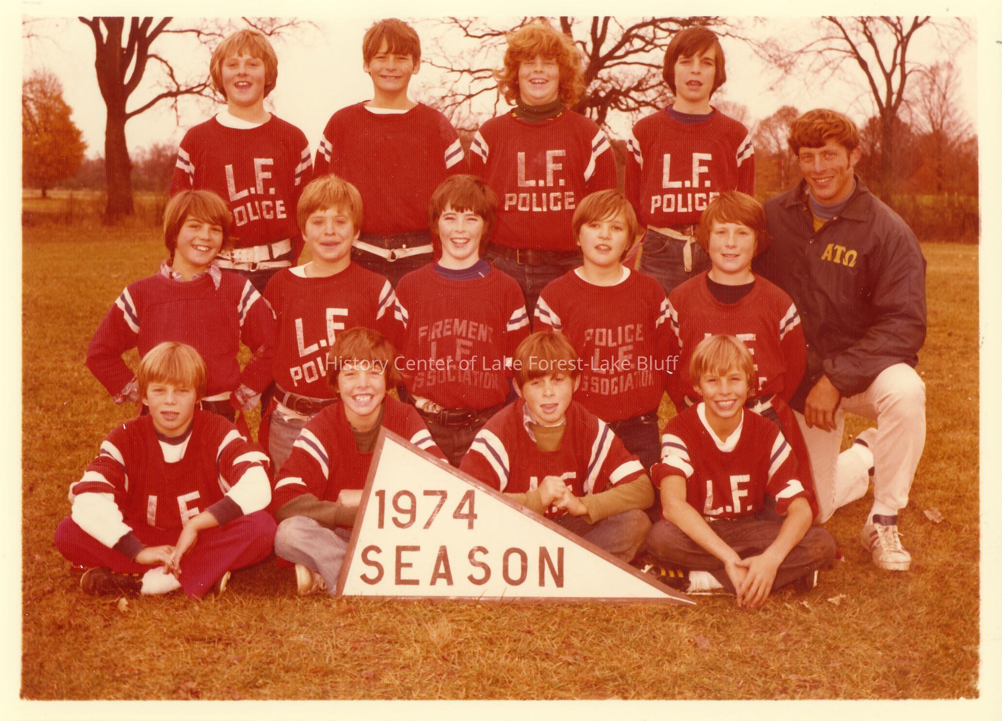 Boys hockey team, 13 players and one coach, uniforms are red and have the LF police written on the front