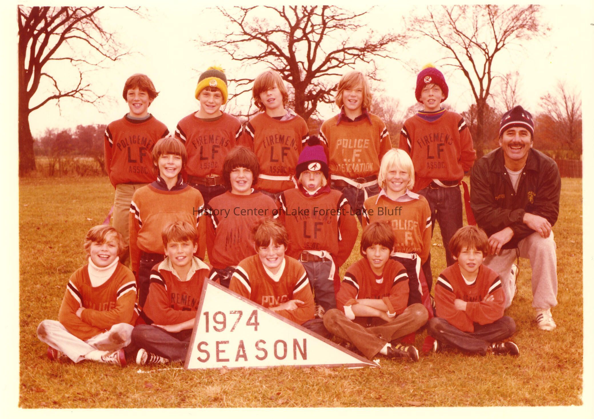 team photo - 14 players, one coach, banner says 1974 season looks like hockey team sponsored by LF firemen and LF policemen.