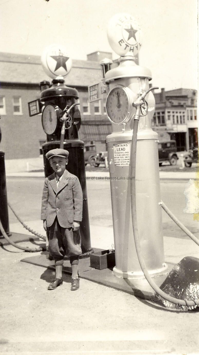 Unknown boy standing next to pumps Herman Johnson, owner, Texaco Gas Station, NW Corner Bank Lane and Illinois Rd