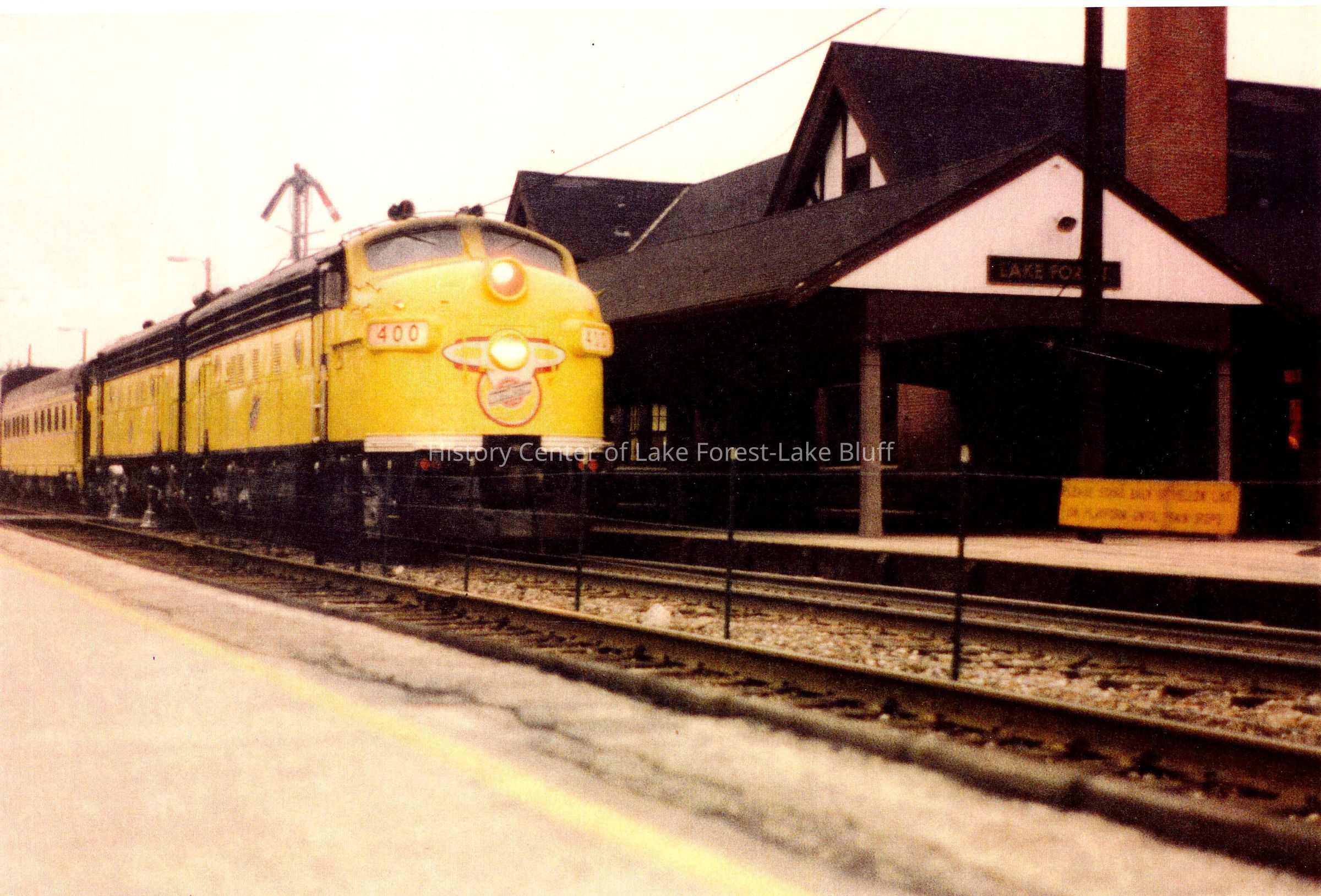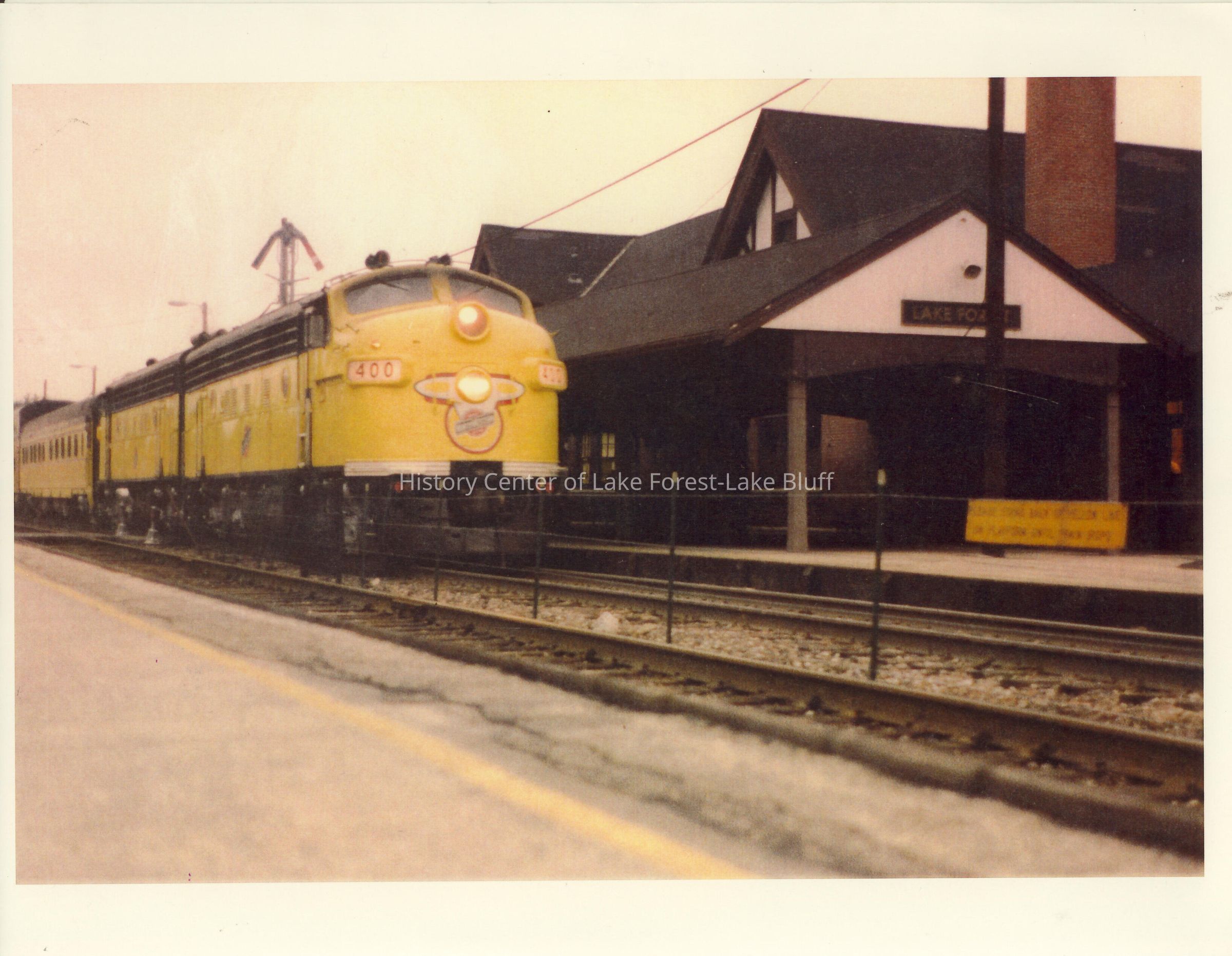 Color photograph of the Lake Forest Train Station. The 400 yellow train is standing at the station. Chicago and North Western depot.