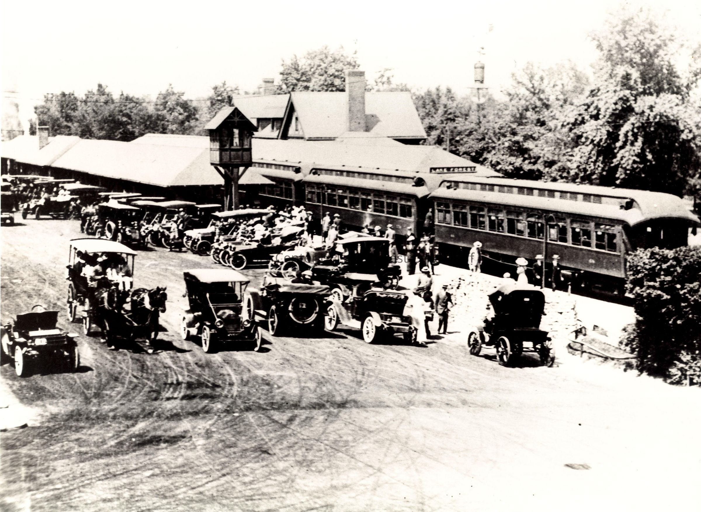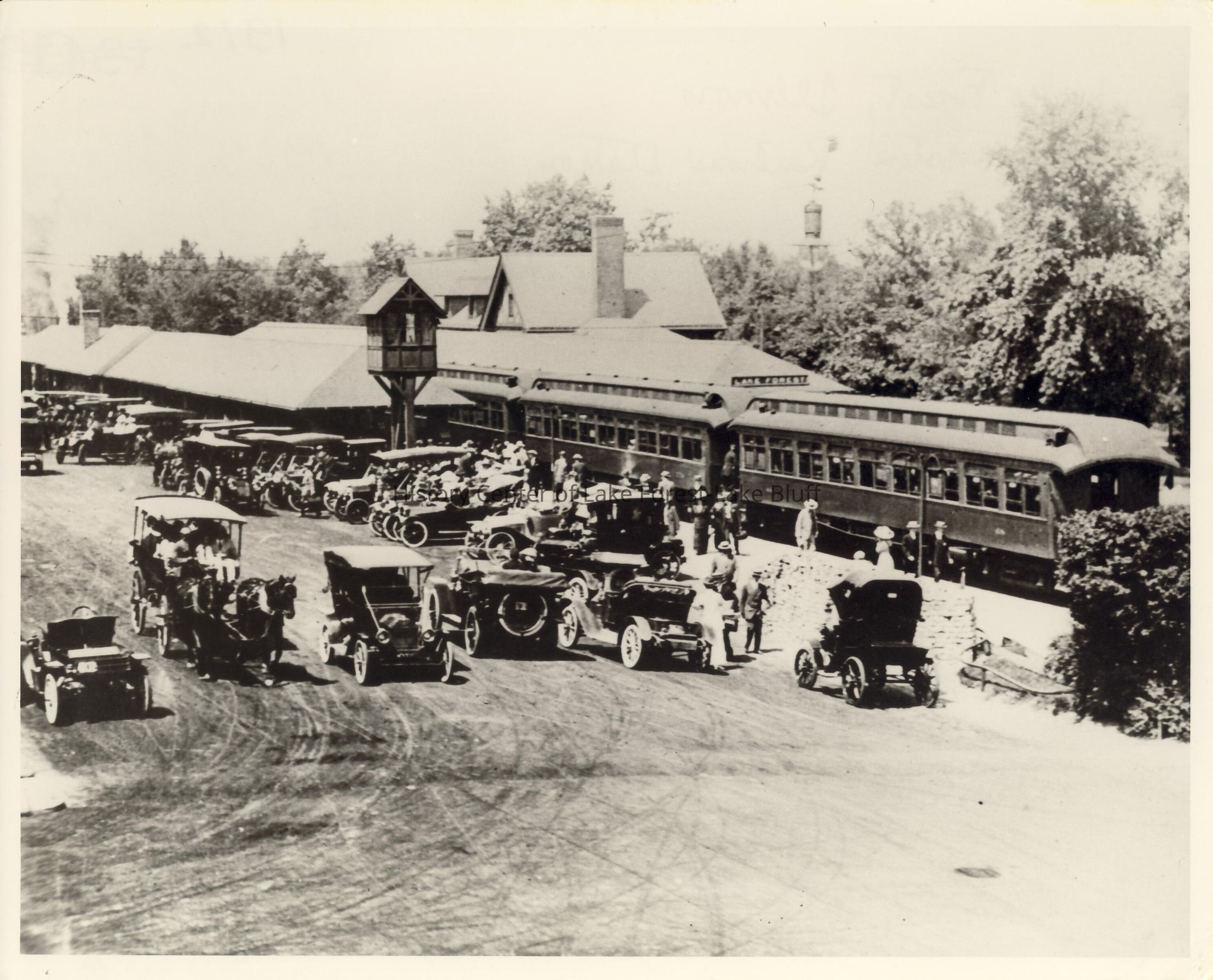 Black and white horizontal 8 x 10 photograph of the 5:10 arriving at Lake Forest Train Station. Several electric motorcars are coming and going. A horse and buggy is also present. A more complete copy of the photo and description can be found in record 2002.320.18 which has the date 1905