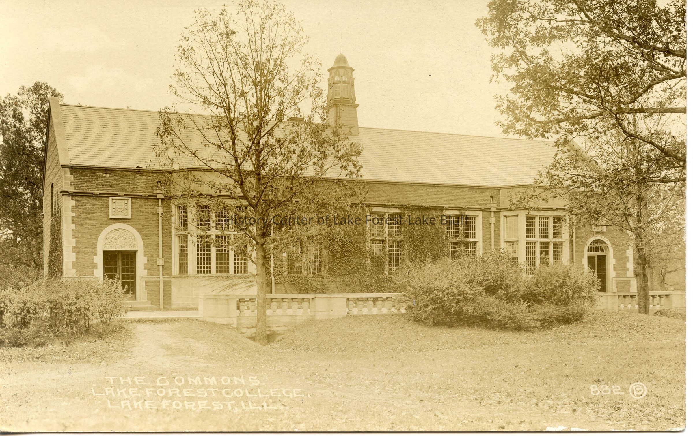 Black and white postcard, probably by H. H. Brooks, 832. The Commons building at Lake Forest College. Back not5 split.Lexicon