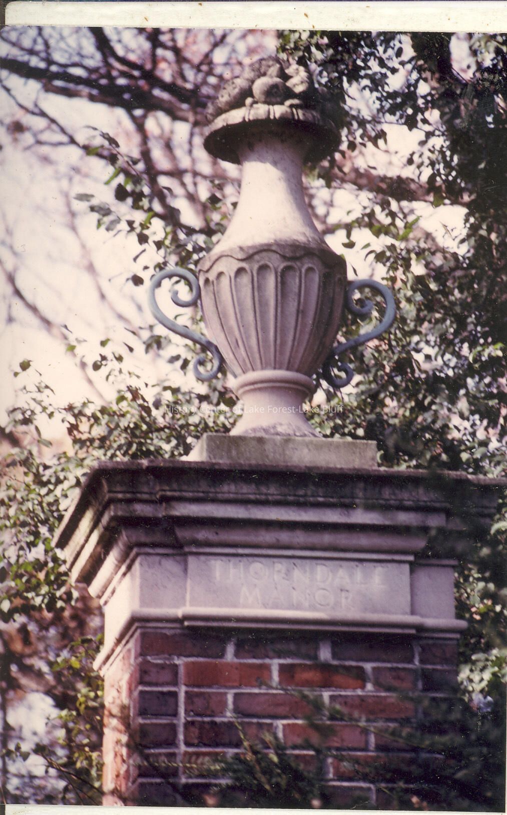 Fluted urn atop brick and stone pillar at entrance to residence.