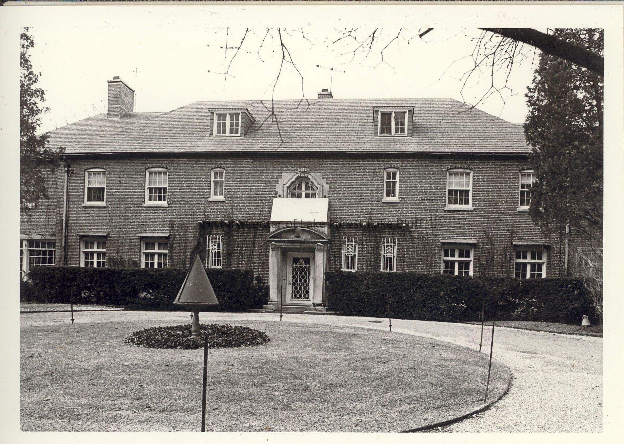 Two story brick residence with slate hipped roof with flat-roofed dormers. Above center entrance is a window beneath a stone basket of flowers. Entrance door and three first-story windows are covered with grills.There is a circular lawn with a statue in the middle, surrounded by a circular drive. Photo is dated March 7, 1981