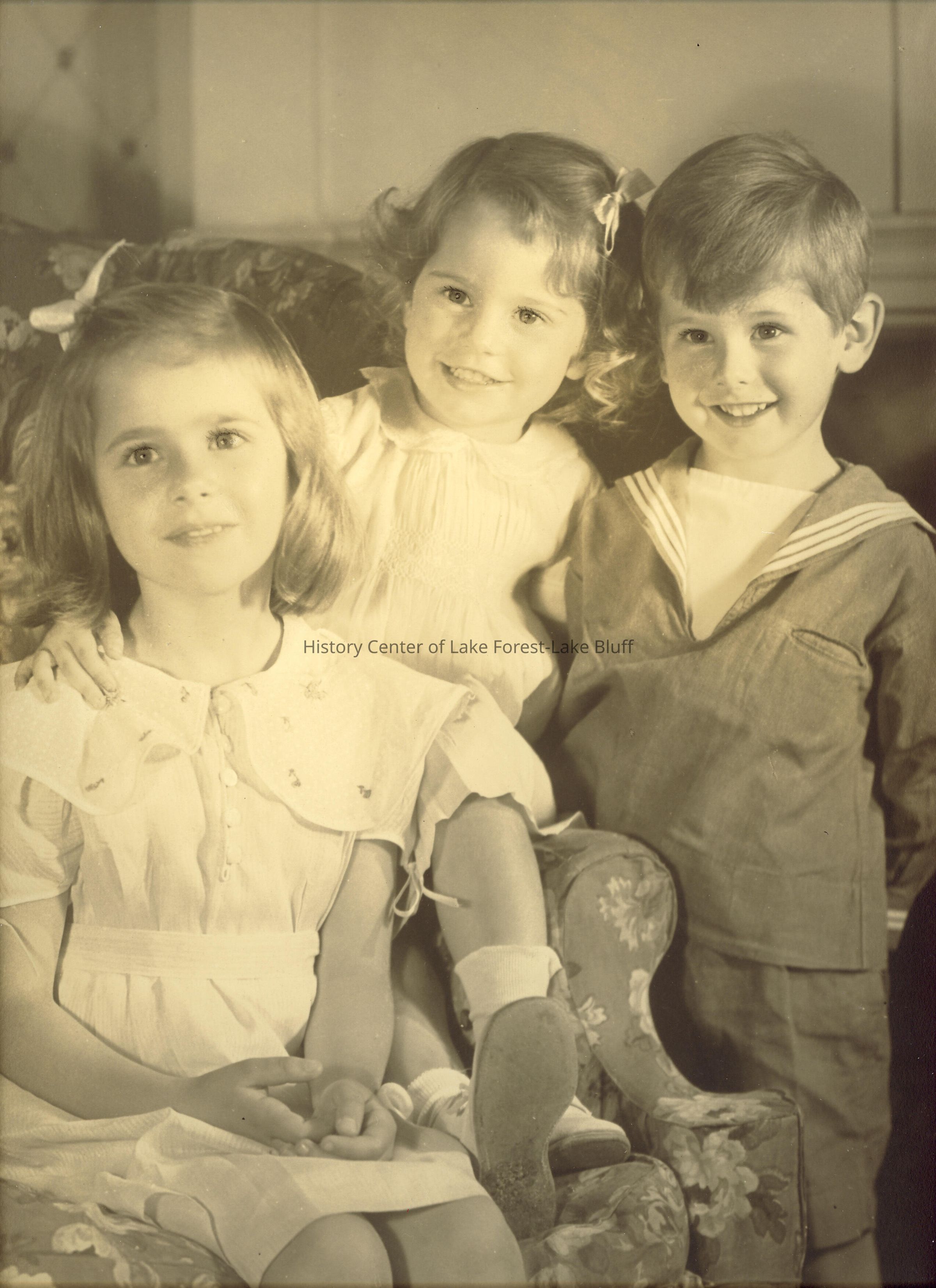 3 kids. the oldest girl on floral chair, younger girl on the arm rest with boy in sailor suit standing beside the chair (Scan bed not large enough to fit entire image; photograph is larger than what is shown here)