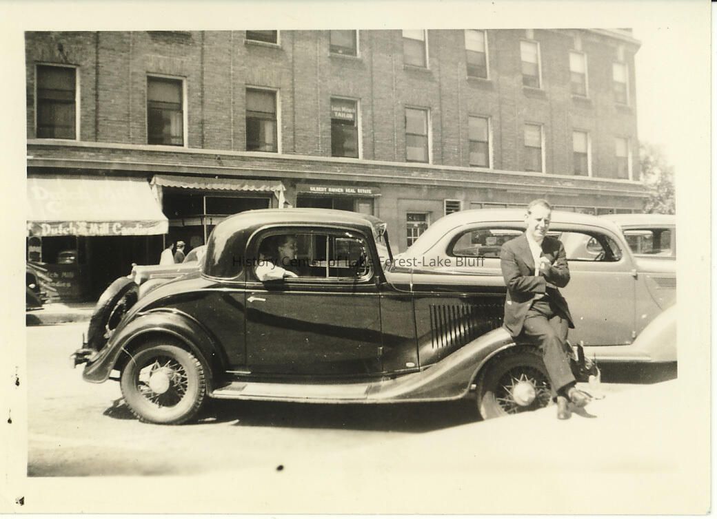 Tommy McDermott and Vicky Parshall Julian on Deerpath. Dutch Mill Candies at 284 East Deerpath (1942 phone book) awning can be seen and Louis Minarik, Tailor at 290 East Deerpath (1942 phone book), as well as Gilbert Raynor Real Estate