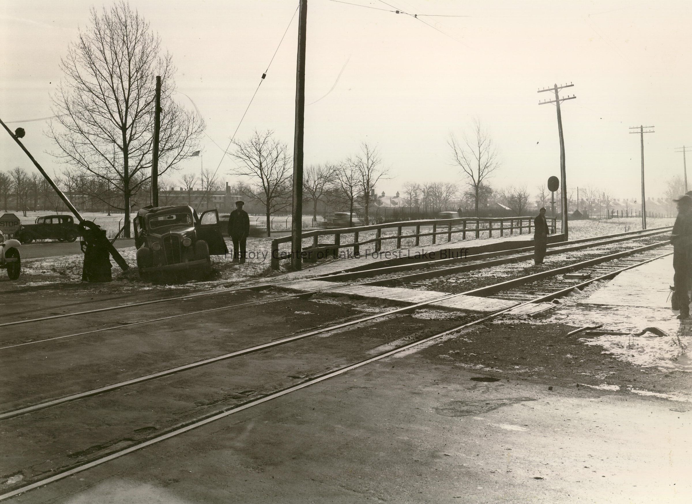 Traffic accident on the railroad tracks near the entrance to Fort Sheridan, at Sheridan and Old Elm Road. Fort Sheridan tower is visible in the background. Similar view to 2005.66.116.