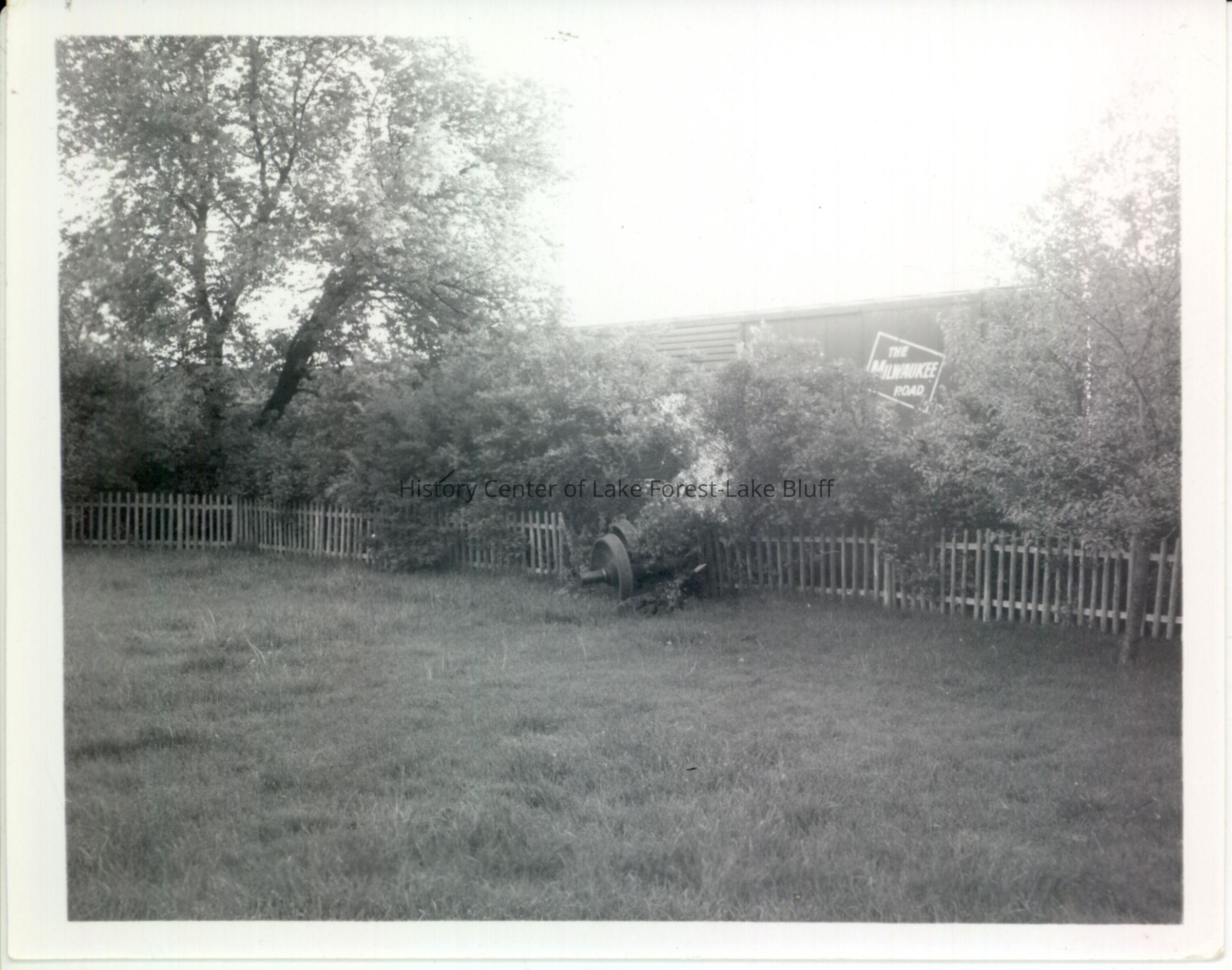 Undated image of unidentified train detrailment. Appears to be taken from someone's back yard - fence is broken. A freight car with the words "The Milwaukee Road" painted on is visible through the bushes.