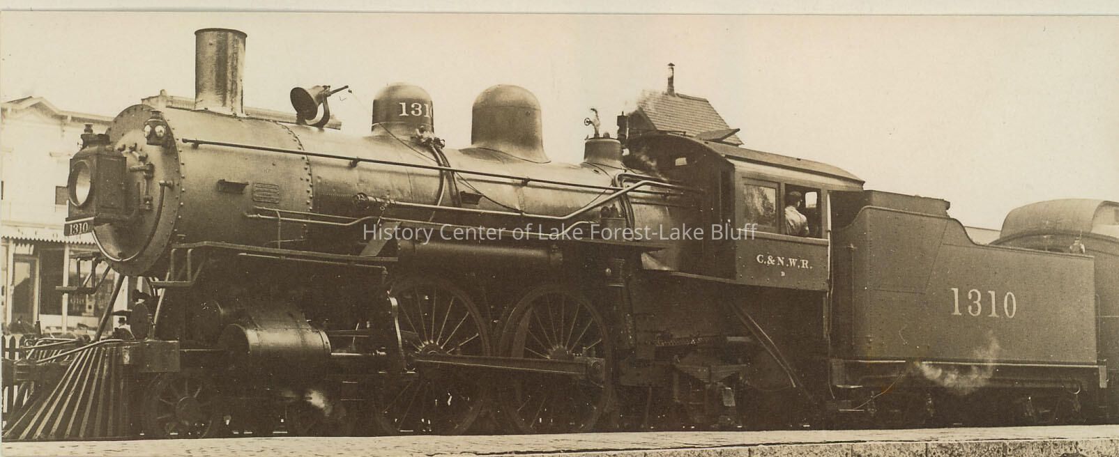 Caption by Bob Janz: "Engine 1310 with passenger train. Engine 1310, a class D Atlantic was built by Schenectady in May of 1906. Tender coal bunker is fitted with an unusual extension. The smoke box shows definite use of graphite." Train is southbound, taken at Lake Forest, IL .