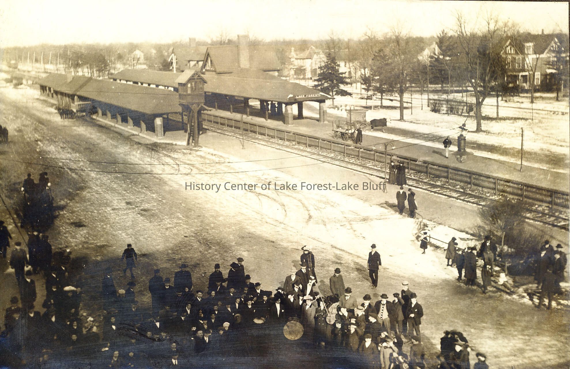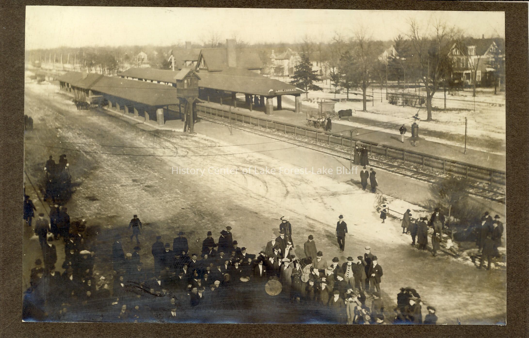 Black and white sepia toned photograph of the Chicago & North Western train station and Western Avenue. Circa 1900. Image is mounted on black construction paper. Winter scene of a large group of people are clustered in the lower left side. Also in view are some homes on McKinley Road