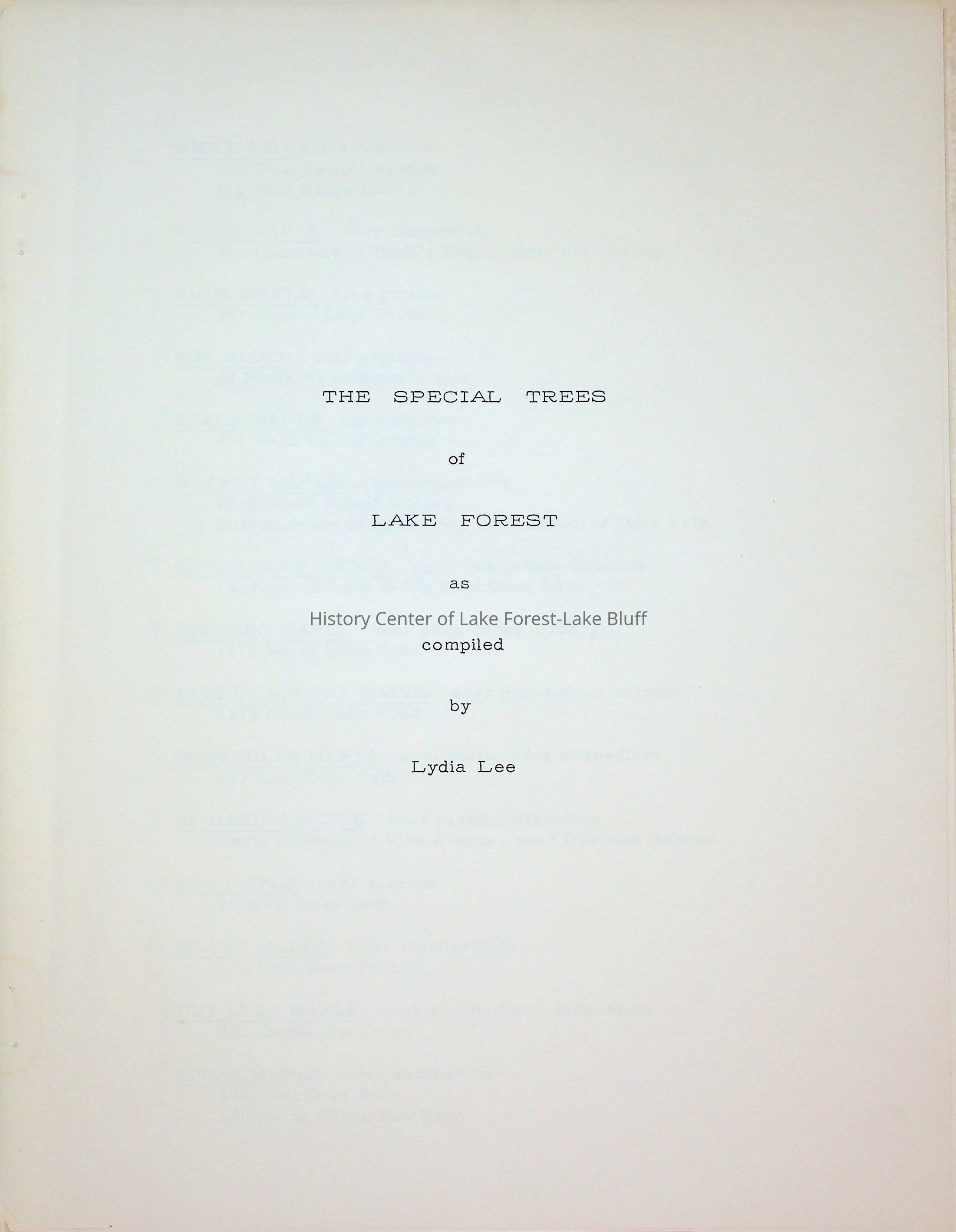 List of the trees found in Lake Forest, along with their Latin names and locations where example specimens can be found. Contains an index with further location details and addenda to the list. Compiled by Lydia Lee, a teacher at Lake Forest High.