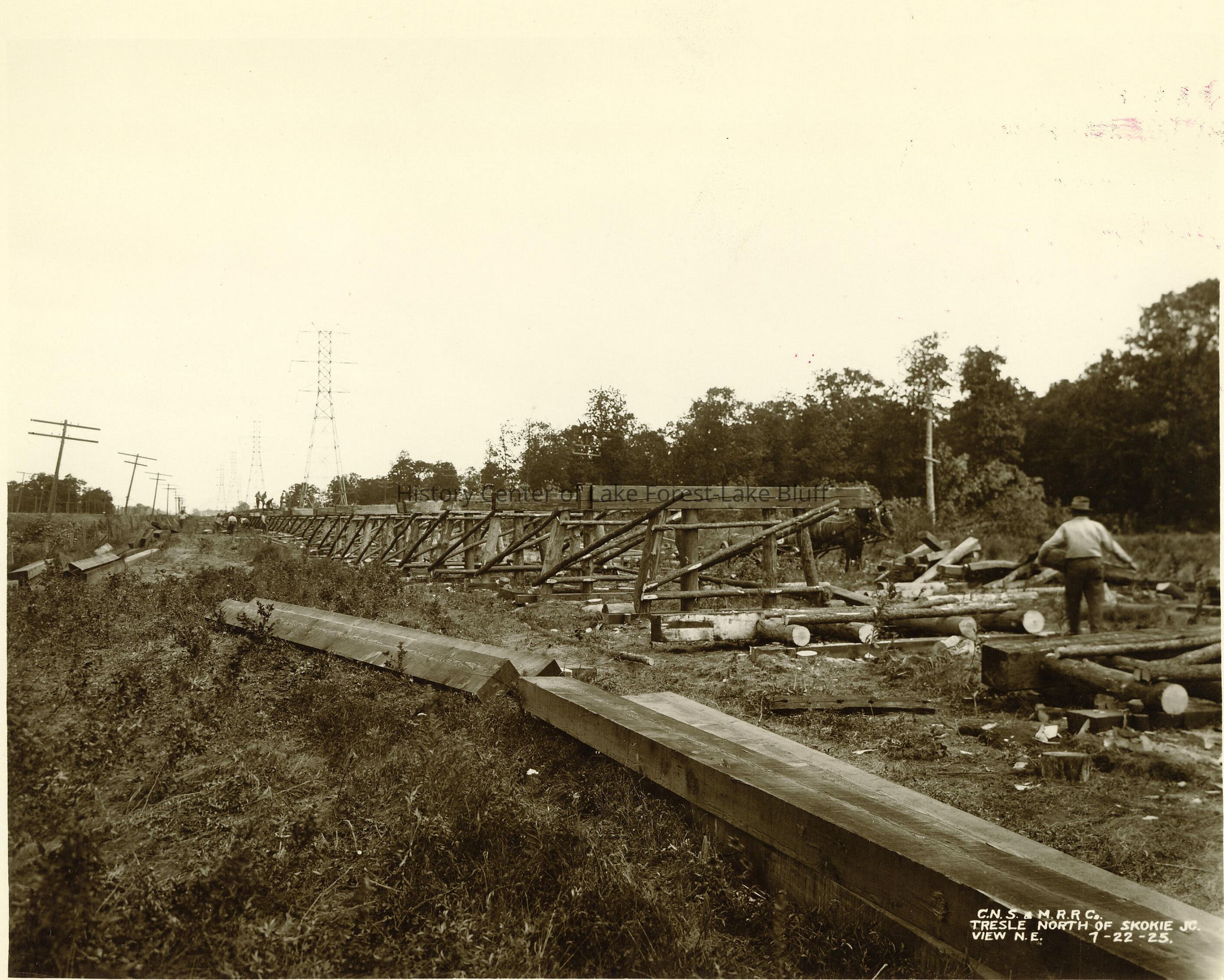 original property of North Shore Line Advertising Dept., Chicago Trestle north of Skokie junction view northeast 7-22-1925 C.N.S & M.R.R., Co.