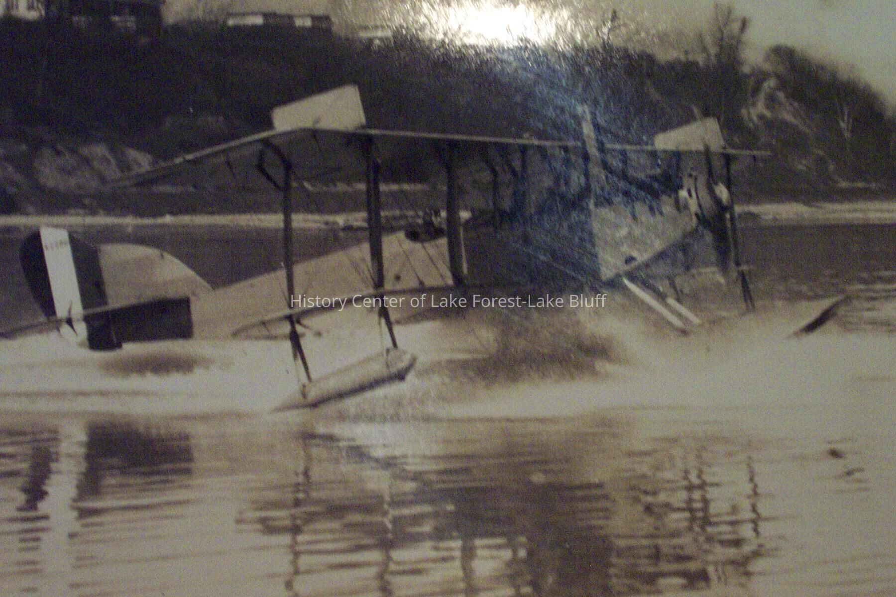 General view of Great Lakes Naval Center Two aviators and a biplane in motion on Lake Michigan