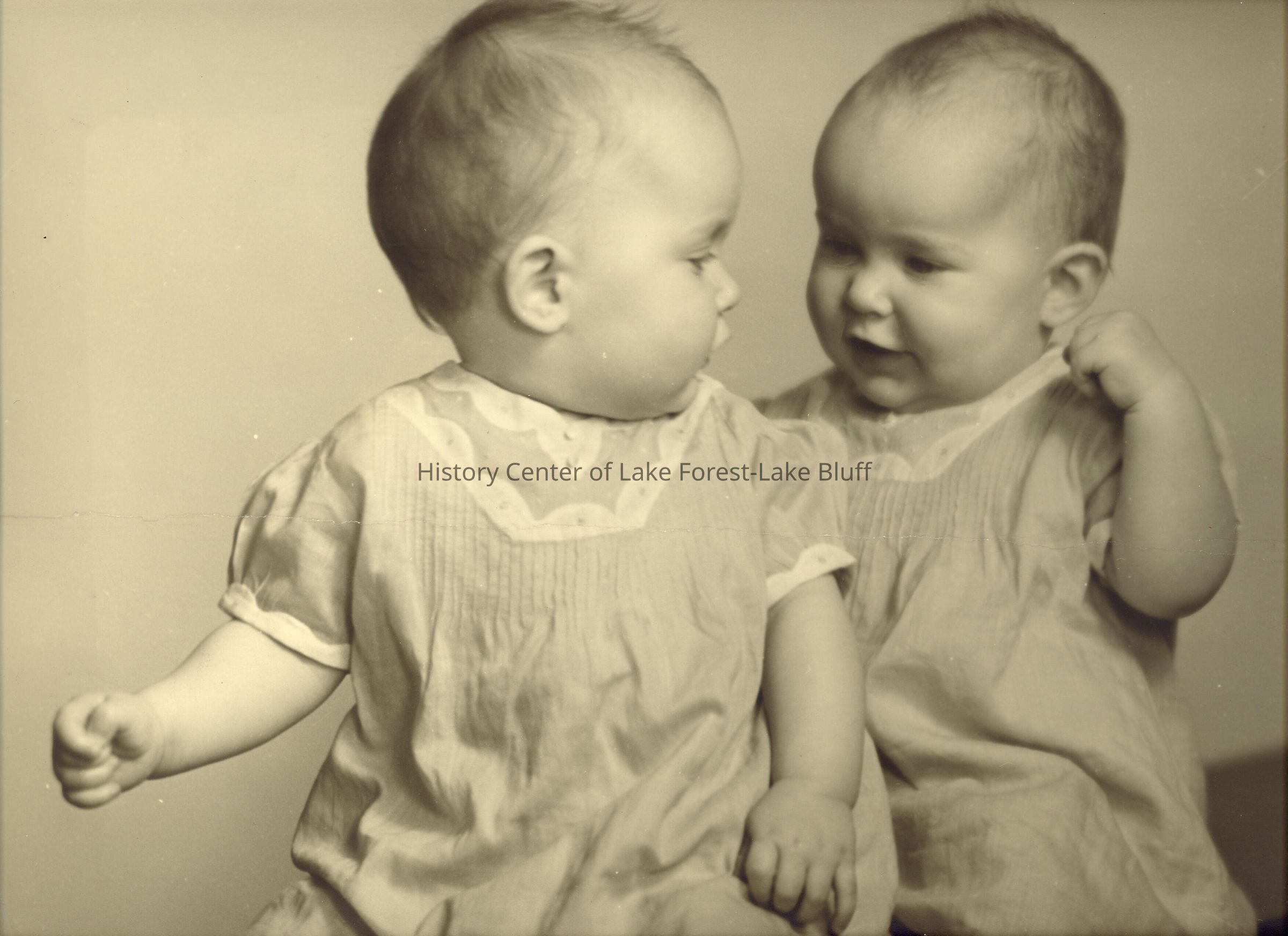 2 babies dressed alike in light colored dresses with pin tucks and lace at chest (Scan bed not large enough to fit entire photograph)