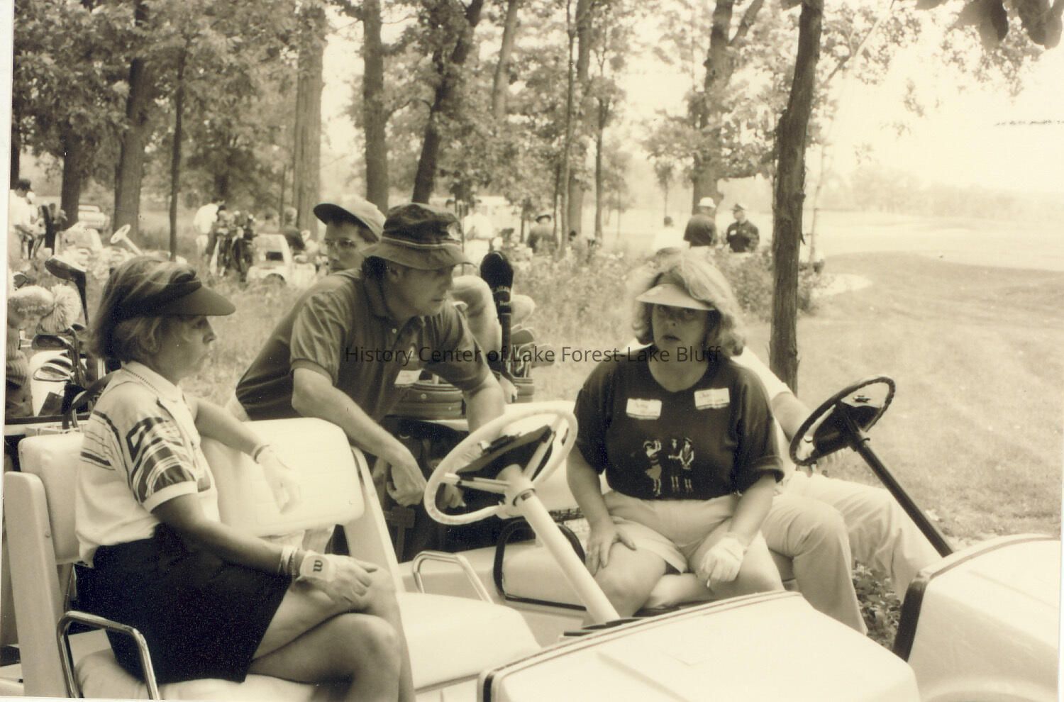 Photo of two women with nametags on their shirts, each in their own golf cart, sitting and talking with a man on the edge of the green.