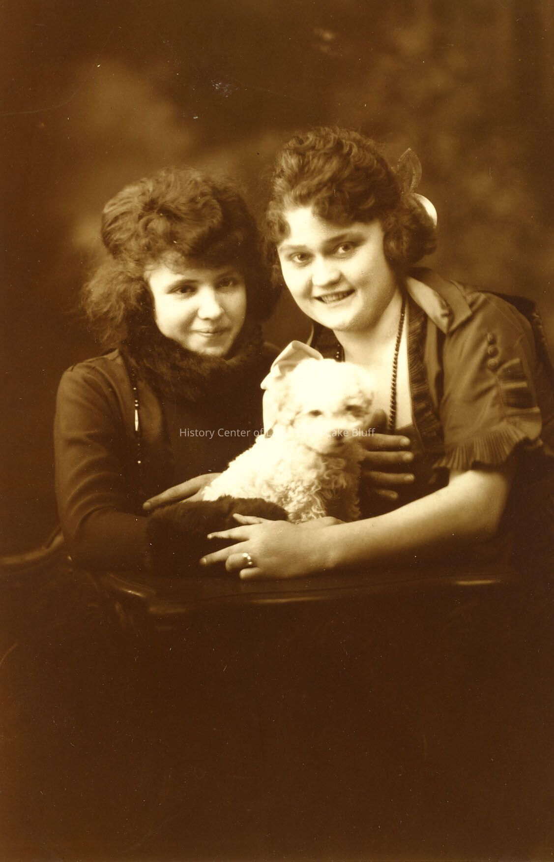 2 unidentified girls with white puppy leaning on a table.
