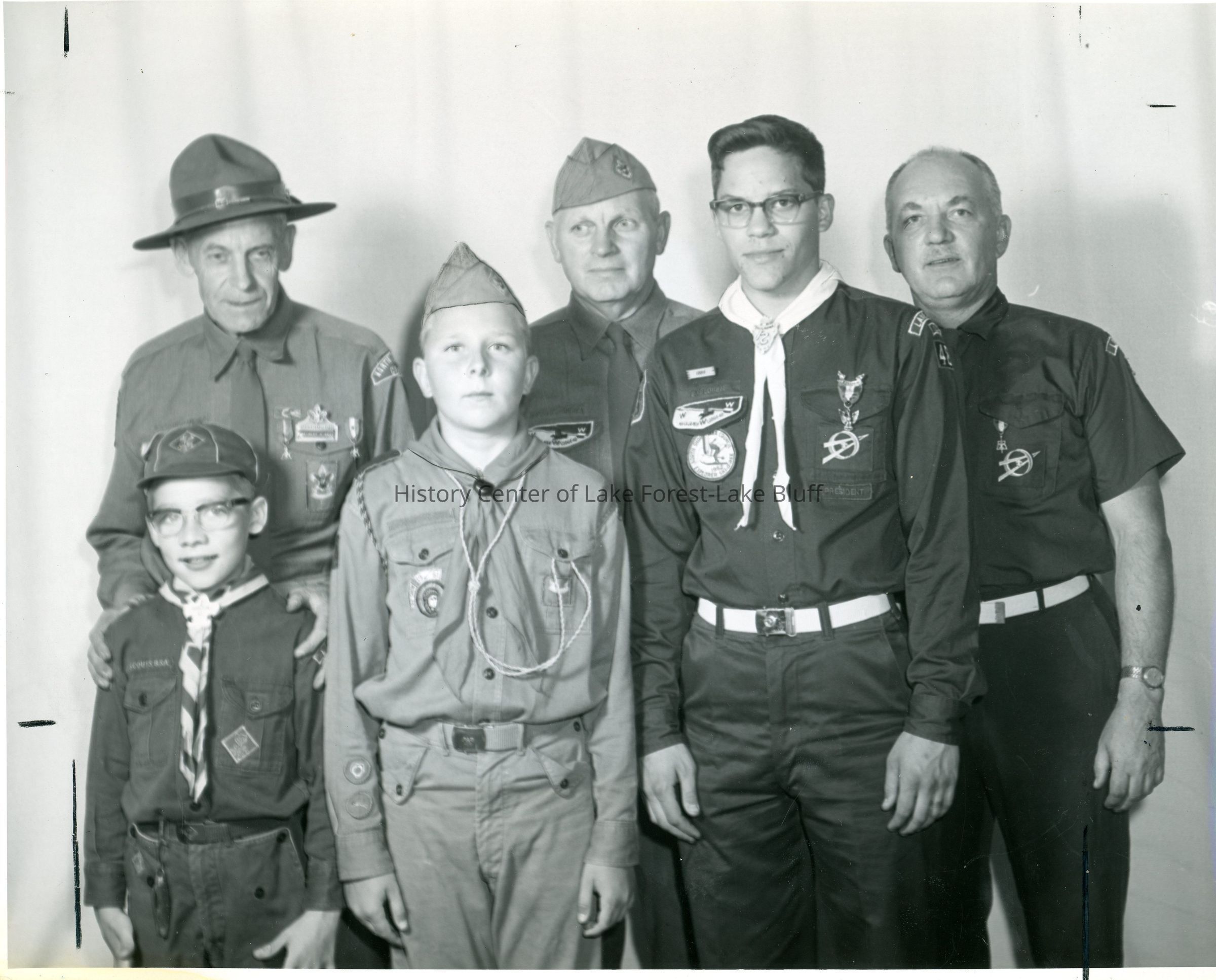 A group of men and boys, varying in age, all in uniform. Associated with American Legion McKinlock Post 264 or the Boy Scout Troop 48. Circa 1961.