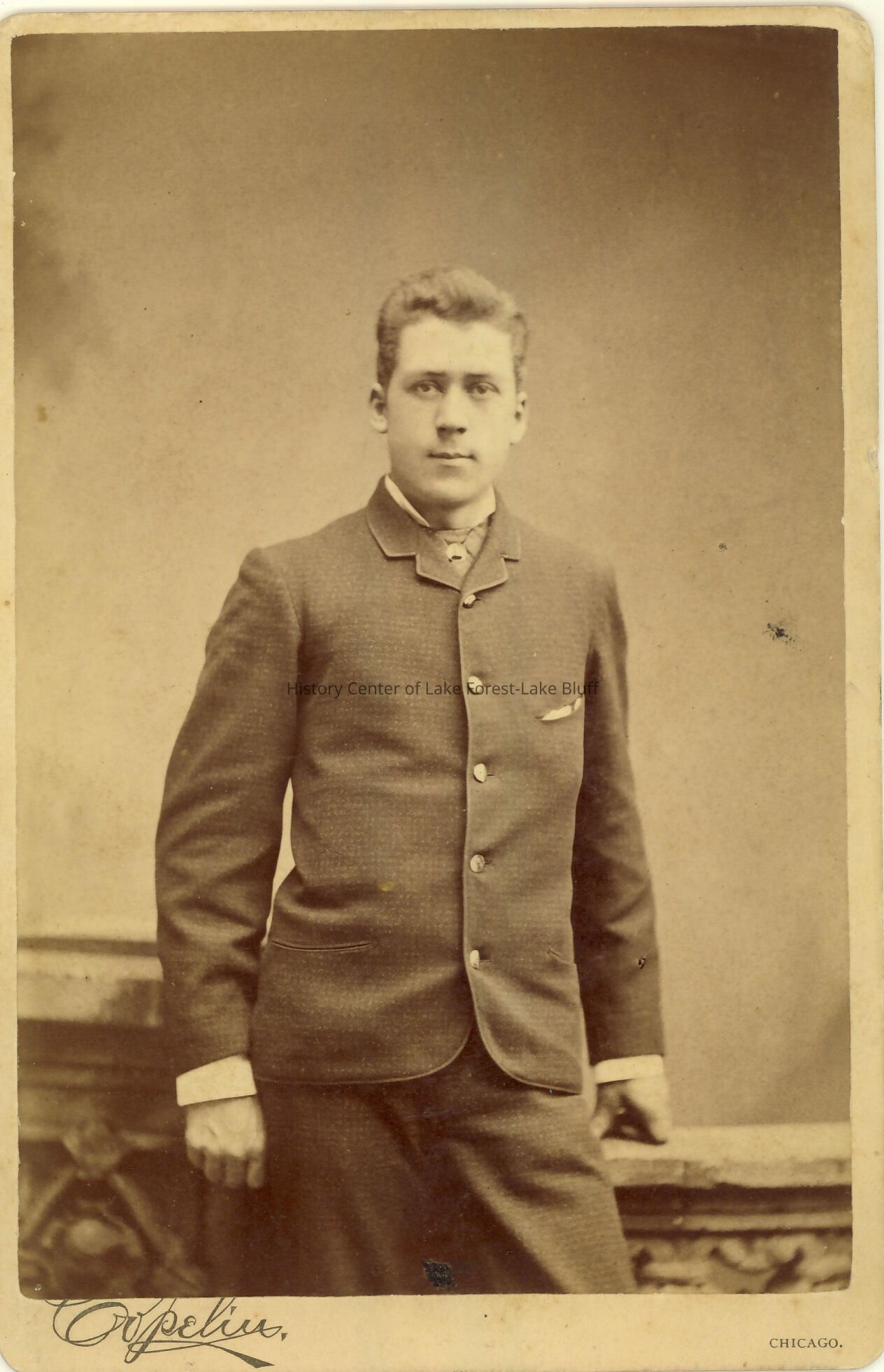 W.B. Mclure Walbridge? Unidentified man Sepia tone on card. photograph by Copelin, N.W. corner Madison and State Streets, Chicago, Illinois elevator entrance, 75 Madison Street