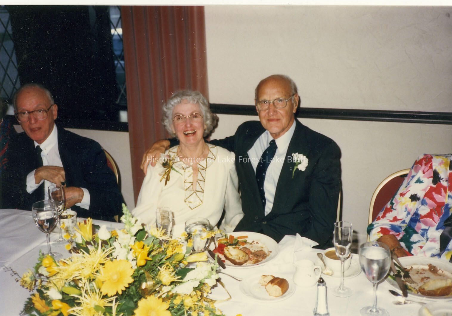 Color photograph of three unidentified people at a banquet table at the Deerpath Inn, dated October 1987. Unclear how connected to Virginia Fiester Frederick.
