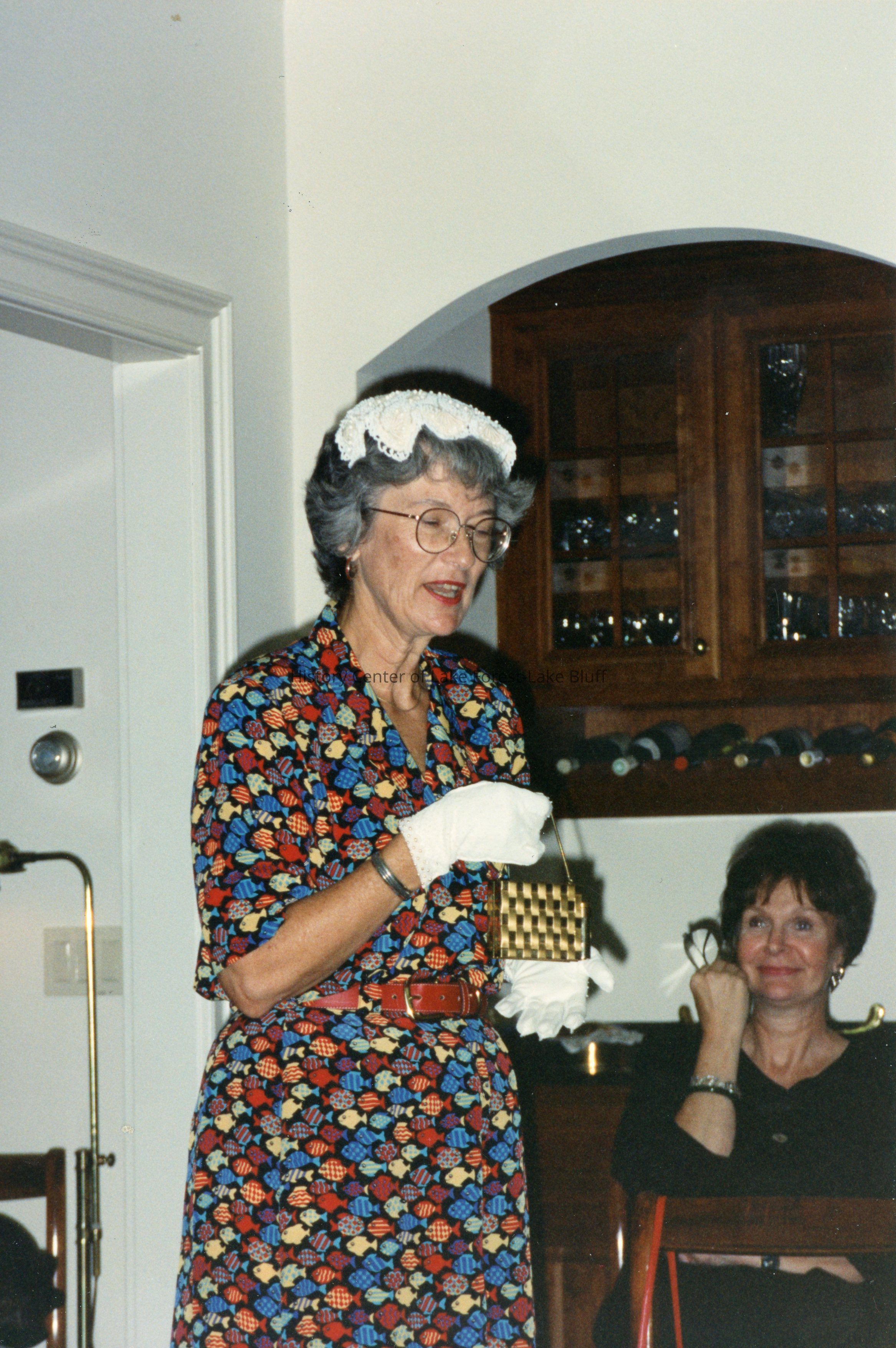 A member of the Market Square Questers wearing historical garb and holding a small bag presents at a meeting.Photograph Details