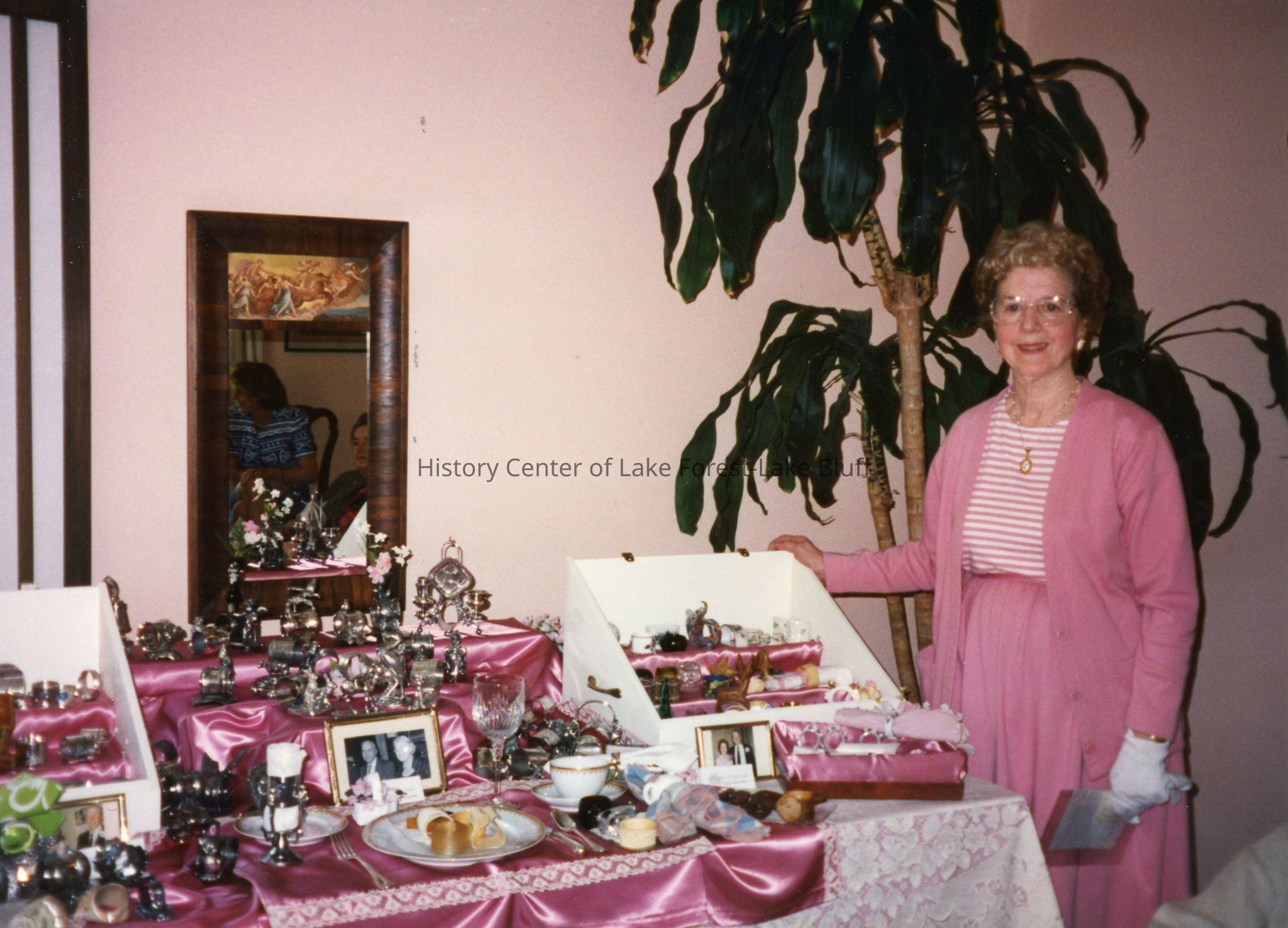 An unidentified member of the Lake Forest Questers with a collection of antiques.Photograph Details