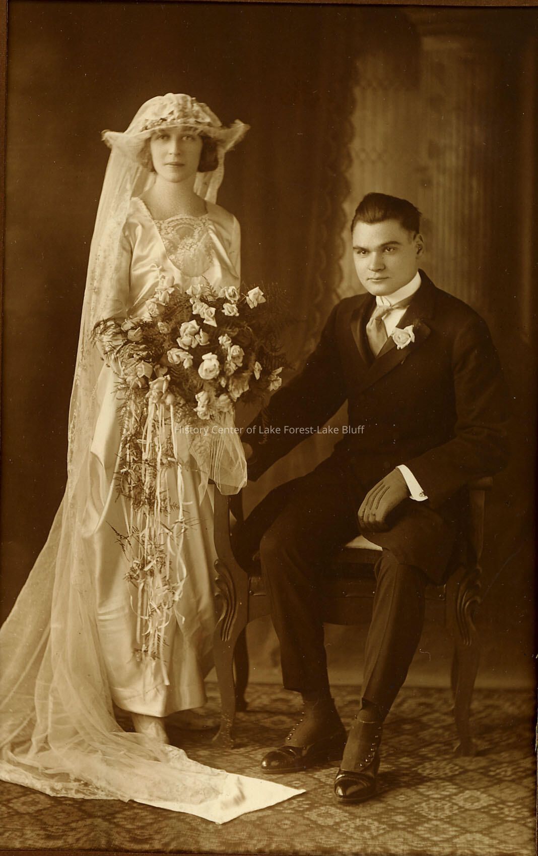 Wedding couple - unidentified. Photo is in brown tri-fold matting. Handwritten note on photocopy of notes that the groom looks like Peter Taileck (Toby, Tailech). Identification source unknown.