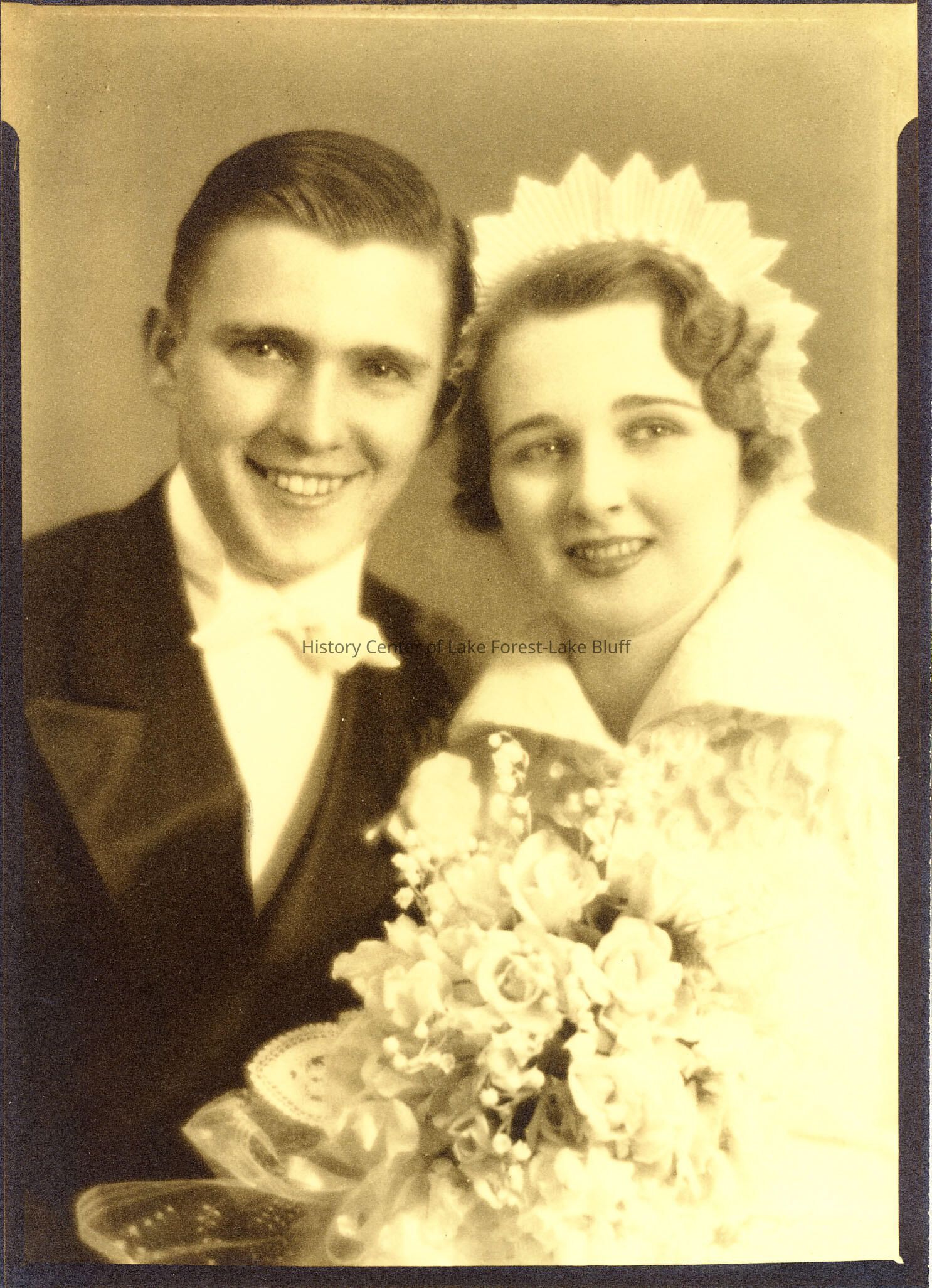 Wedding portrait from the waist up. Bride is wearing head piece.