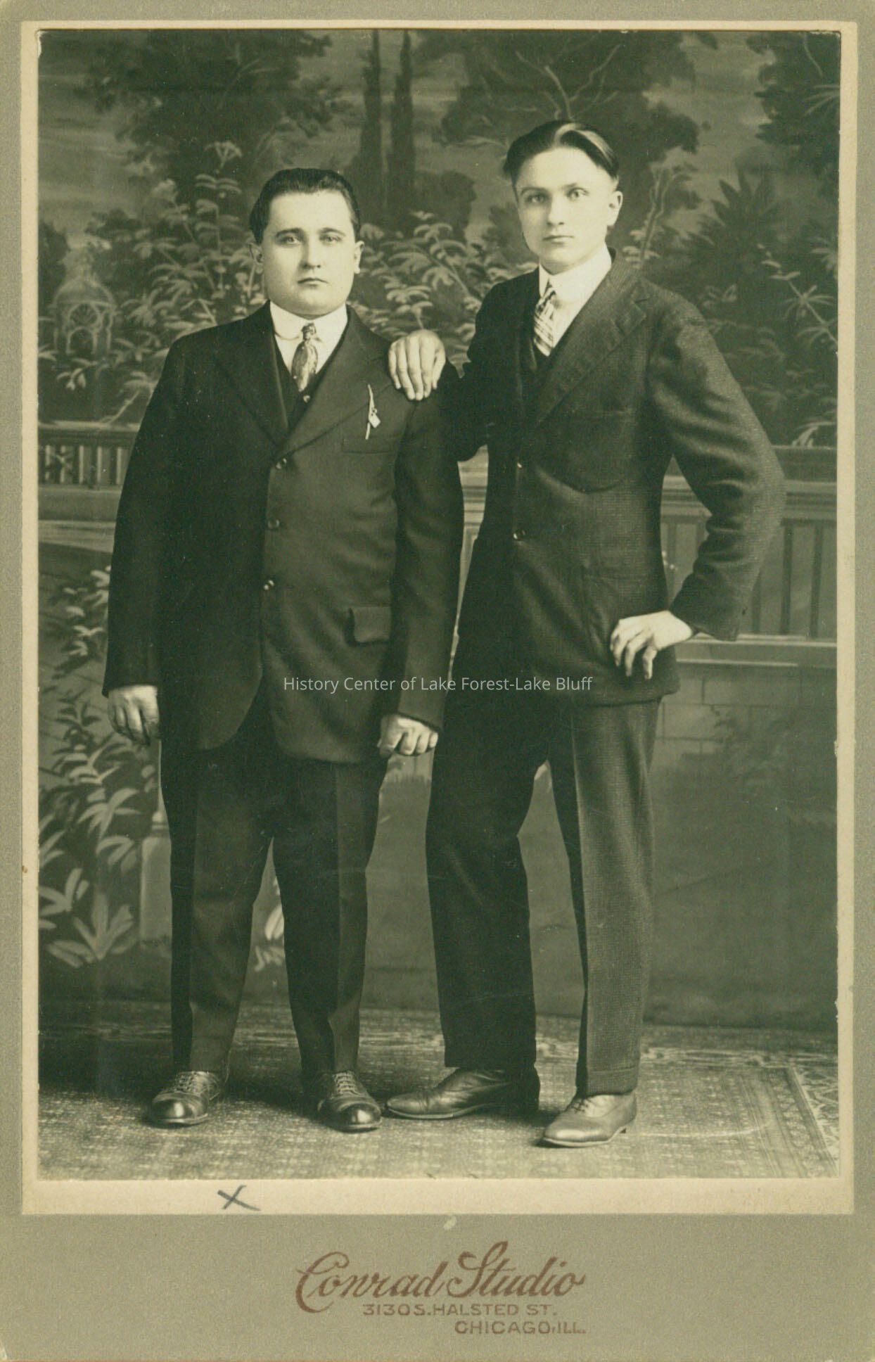 2 young men standing in front of portrait studio background.
