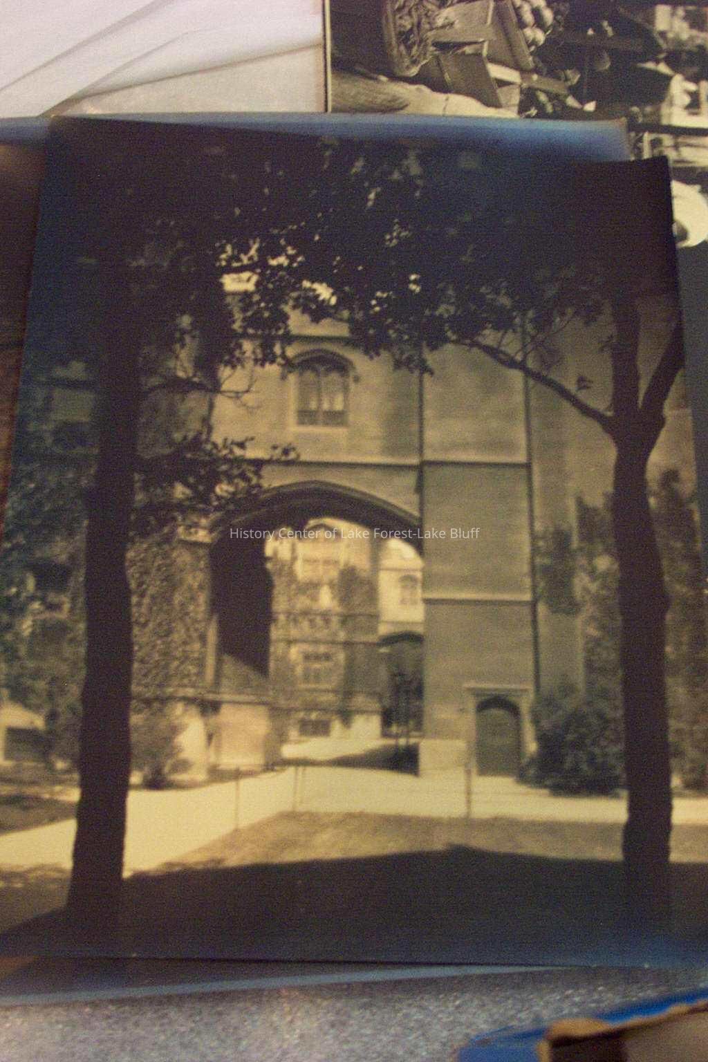 View of the University of Chicago quadrangle looking into arched courtyard. 2 trees in foreground.