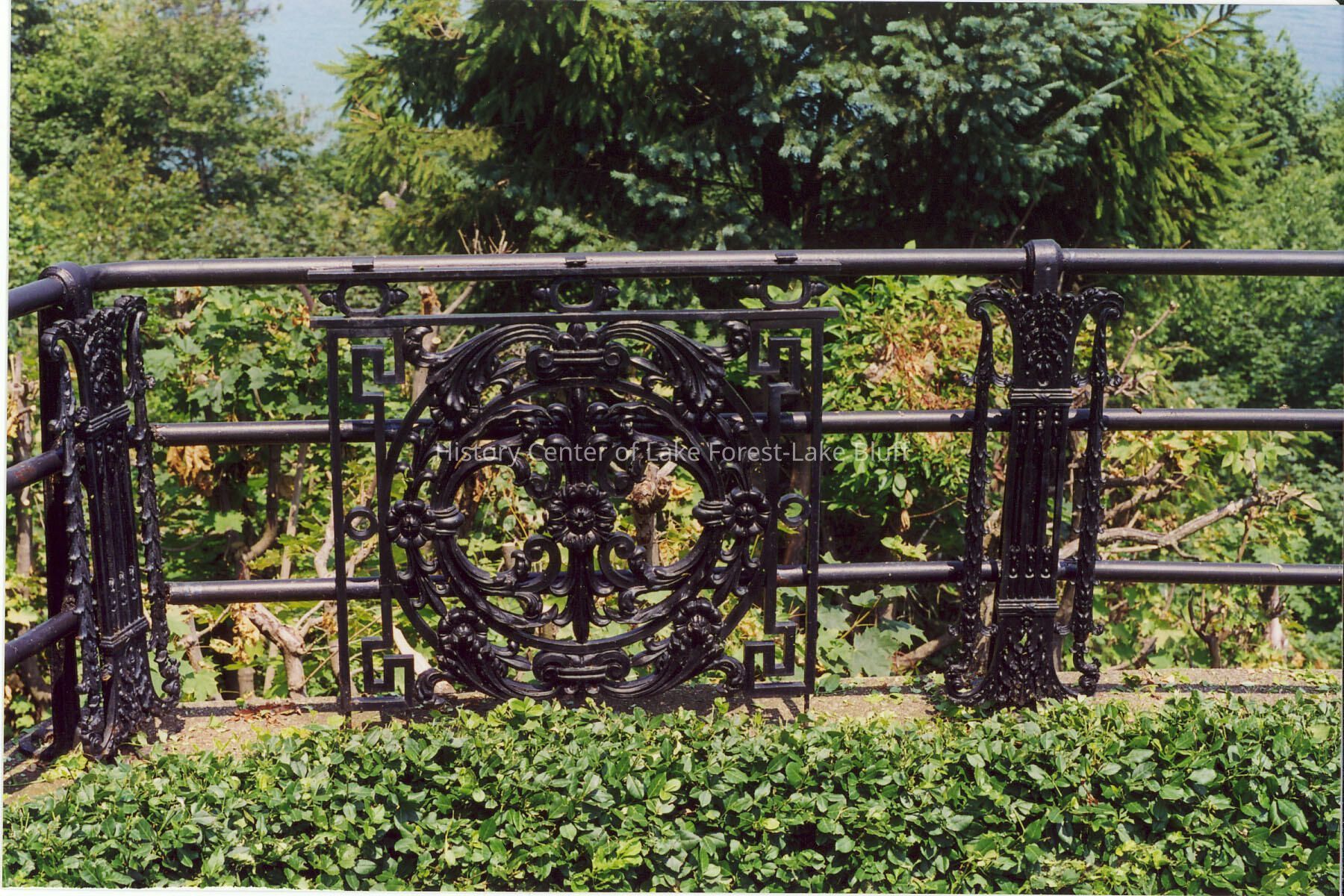 View of fence with circular design at Edward Byron Smith house, 1133 North Lake Road. Donated for possible inclusion in the Walter Frazier book (architect).