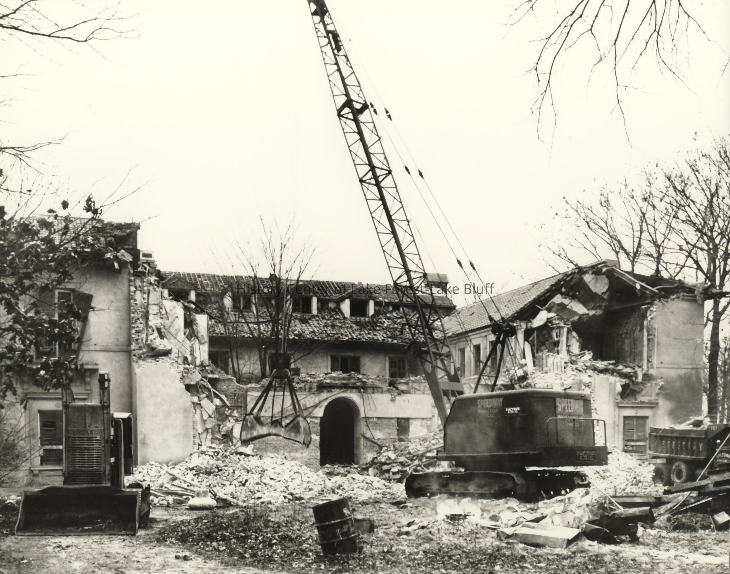 "Villa Turicum," abandoned estate once owned by the McCormicks, showing demolition of estate. Crane is in the foreground. From Chicago Tribune, 1956.