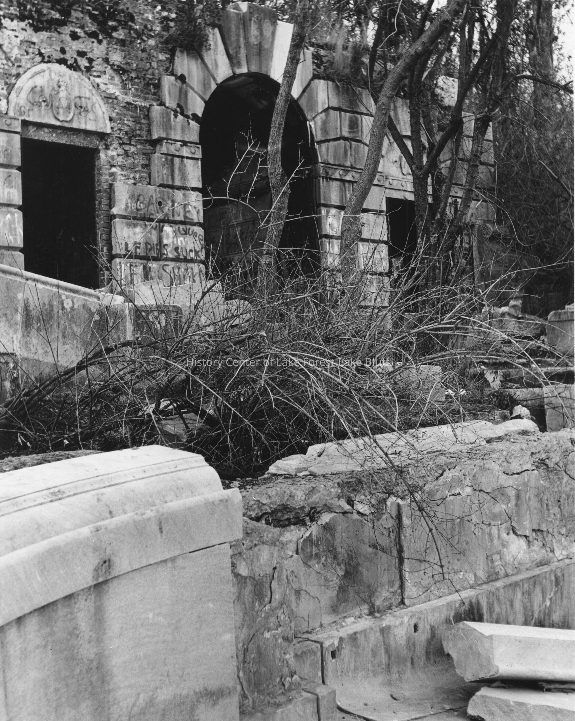 Villa Turicum - Edith R. & Harold F. McCormick Black and white photograph of the bathhouse/cabana next to the swimming pool. The concrete is in a state of ruin and there is graffiti on the limestone blocks. January 12, 1975