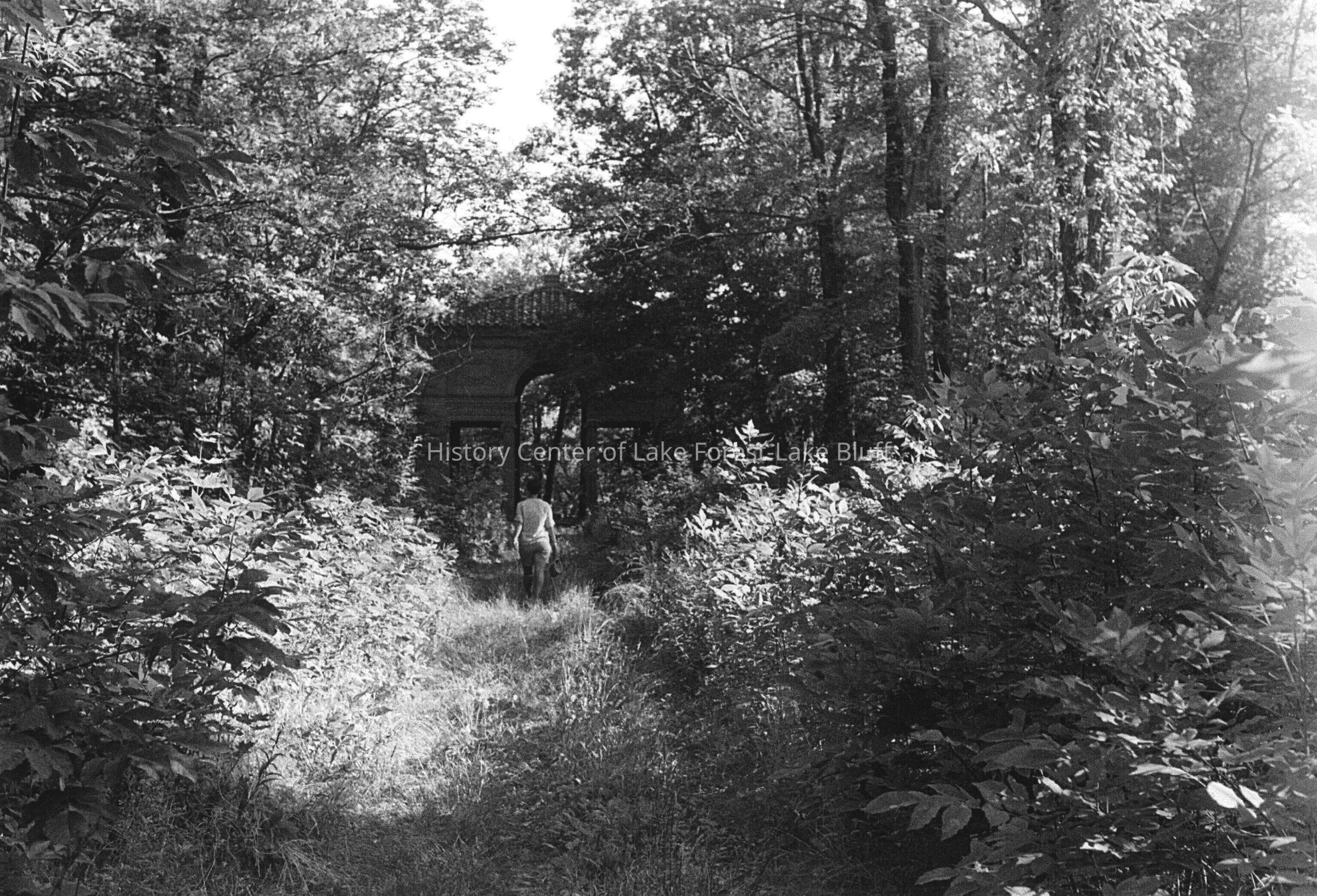 Villa Turicum - Edith R. & Harold F. McCormick Black and white photograph of music pavilon and there is an over growth of trees and there is a person is walking.