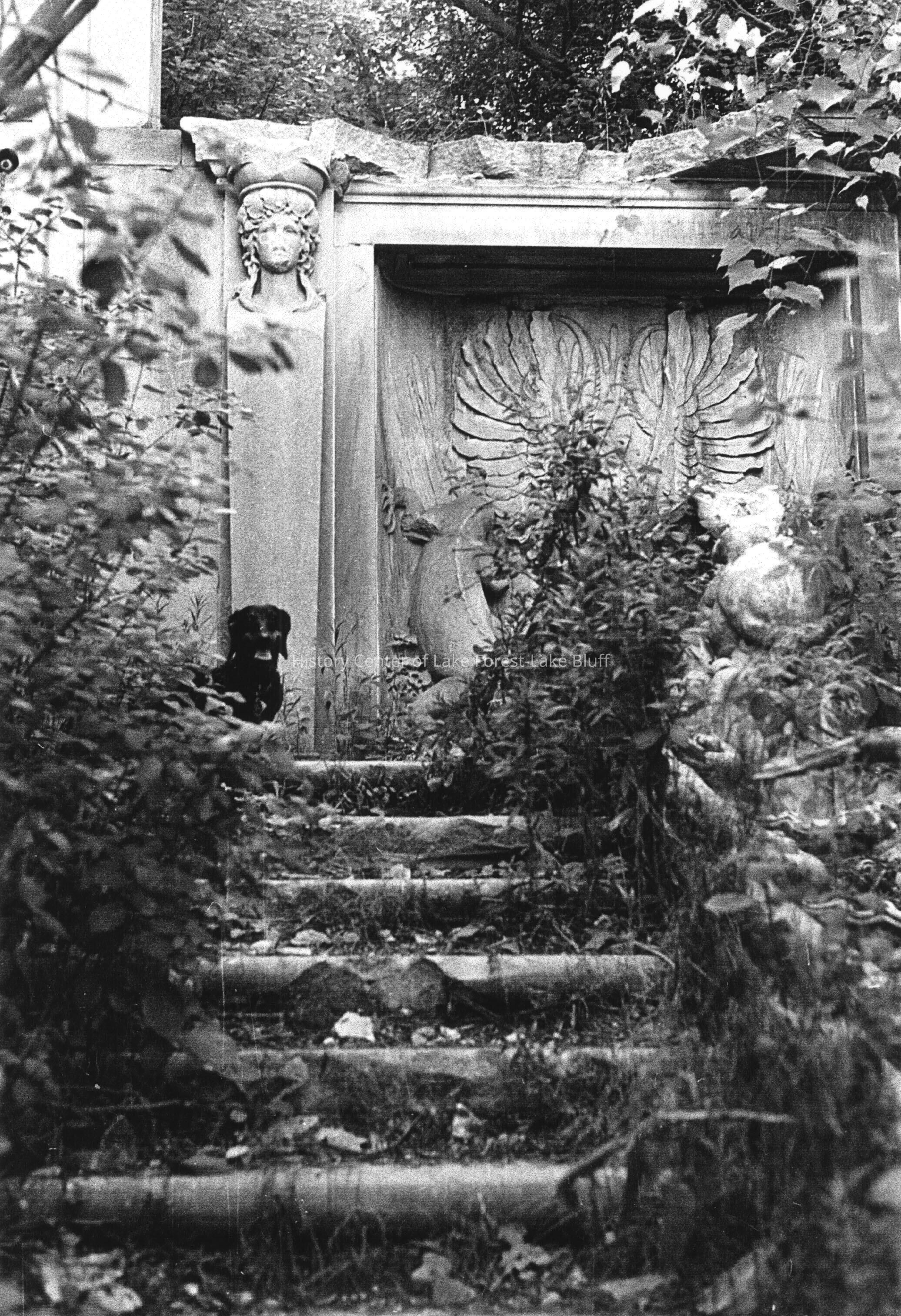 Villa Turicum - Edith R. & Harold F. McCormick Black and white photograph of concrete steps and scupture, which is in a state of ruin and over growth. There is a black dog sitting at the top.