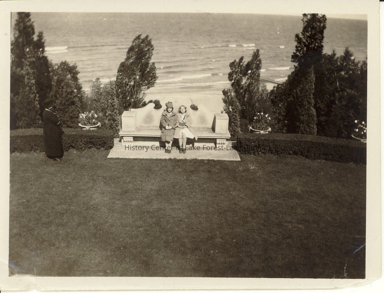 Schulz-Gleiser at Villa Turricum overlooking Lake Michigan 2 women sitting on a large stone bench and one standing to the left