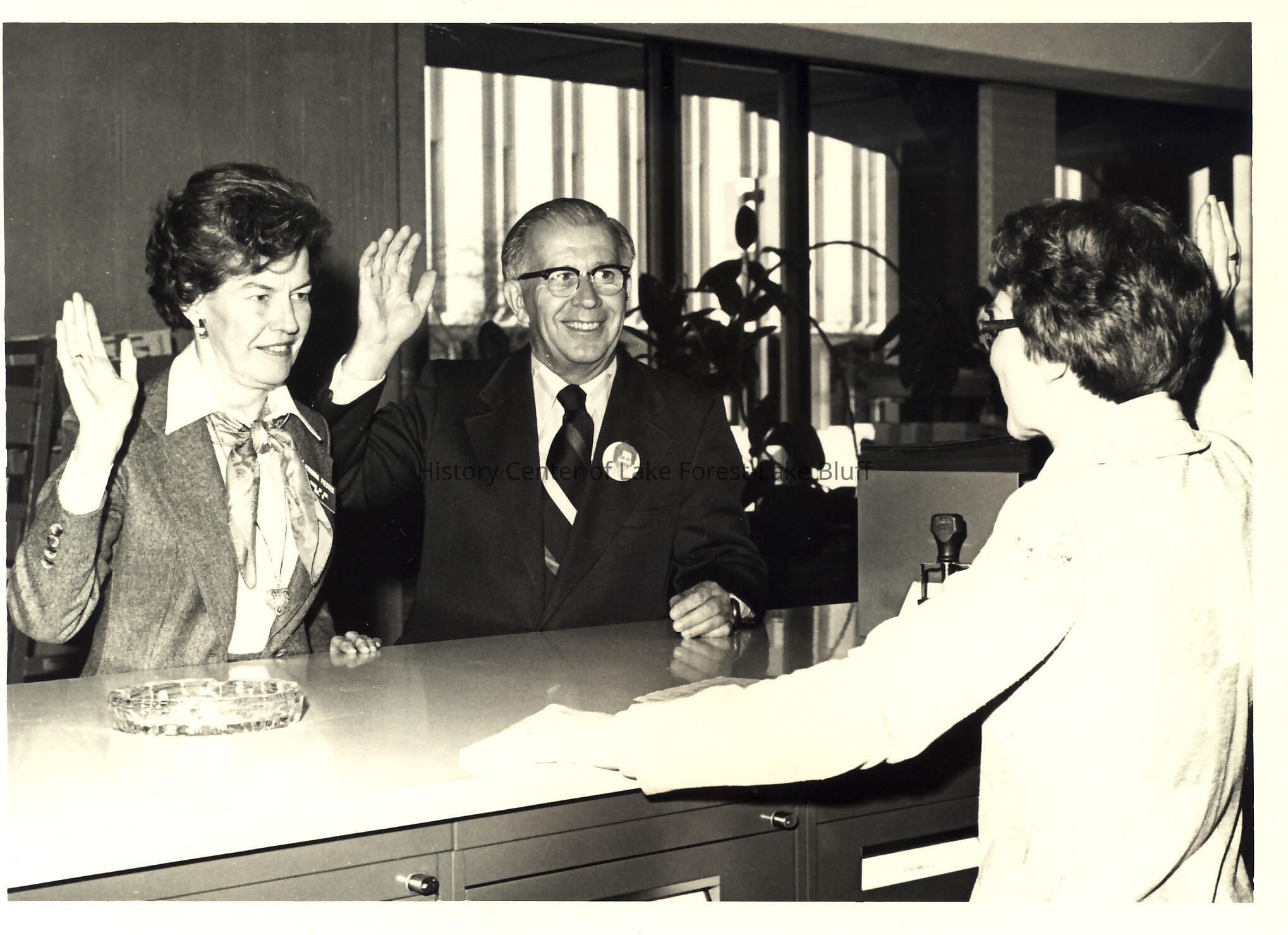 Virginia Fiester, candidate for Illinois House of Representatives, and Kenneth Frederick, applying for a marriage license at the Lake County Courthouse in Waukegan, Illinois. The Deputy Clerk was Penny Kovalenko