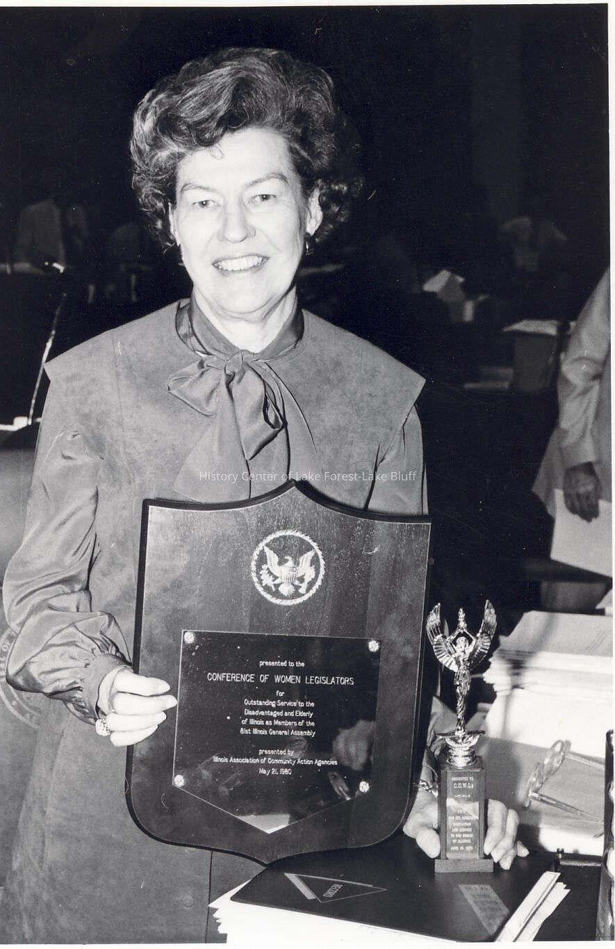 Virginia receiving an award for COWL, Conference of Women Legislators, "for outstanding service to the disadvantaged and elderly of Illinois as members of the 81st Illinois General Assembly." Given by the Illinois Association of Community Action Agencies on May 21, 1980.