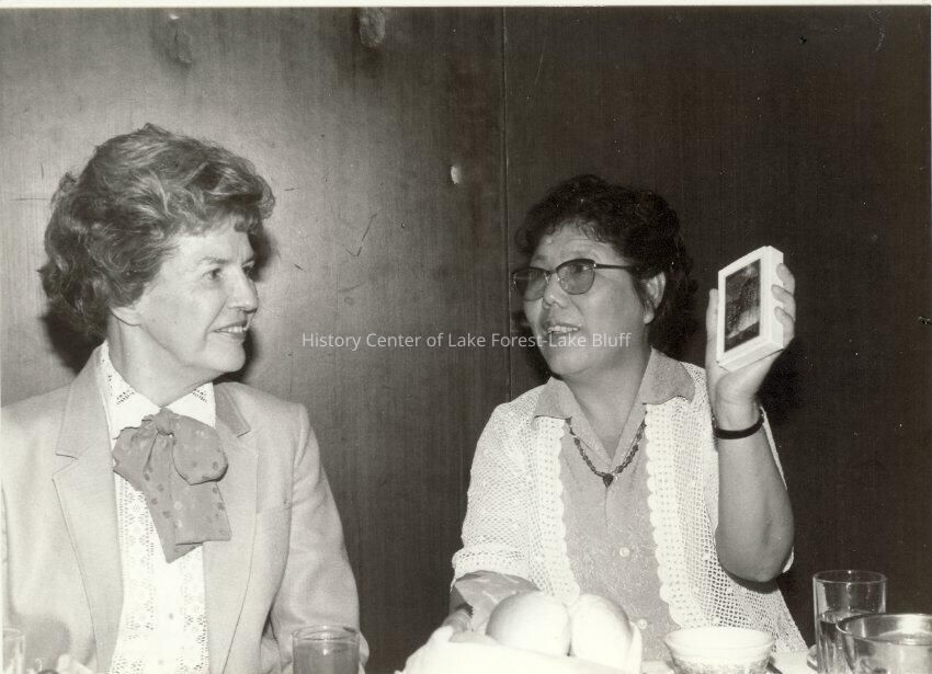 Virginia Fiester Frederick seated beside an unidentified woman holding a plaque - "entertaining a foreign visitor" (see 2007.4.65)