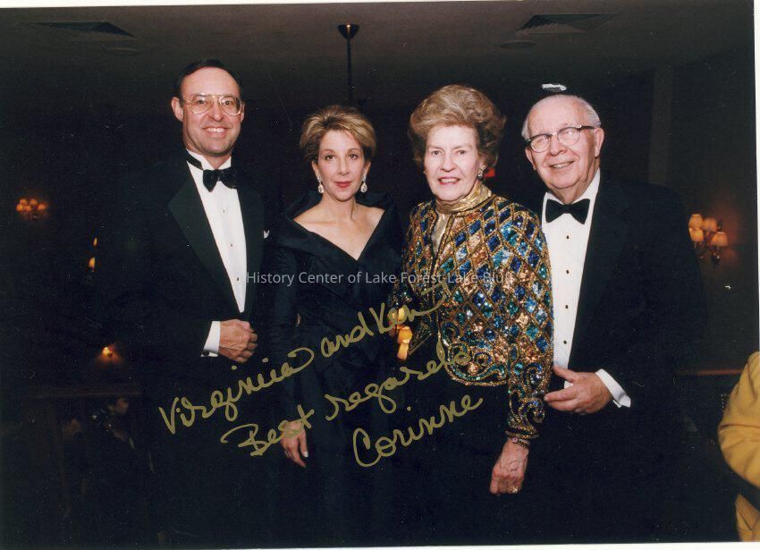 Color photograph of Virginia Fiester Frederick with her husband Ken Frederick and friends at a gathering. Corinne G. Wood, served as the 44th Lieutenant Governor of the US state of Illinois from 1999 to 2003