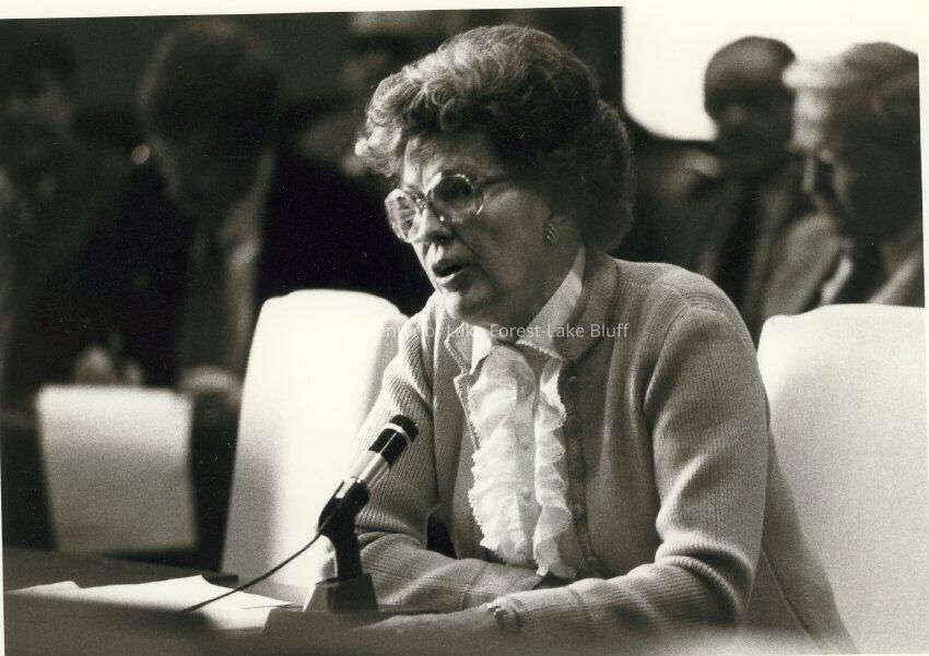 Virginia Fiester Frederick speaking into a microphone, possibly at the Illinois General Assembly 2007.4.66 is a duplicate