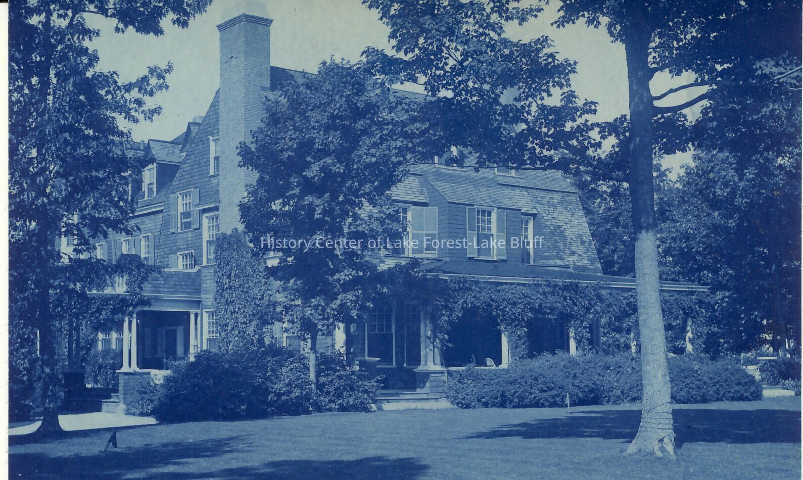 Cyanotype postcard of Walden Estate with full lawn and ivy on porch. Same view as 2001.20.9.