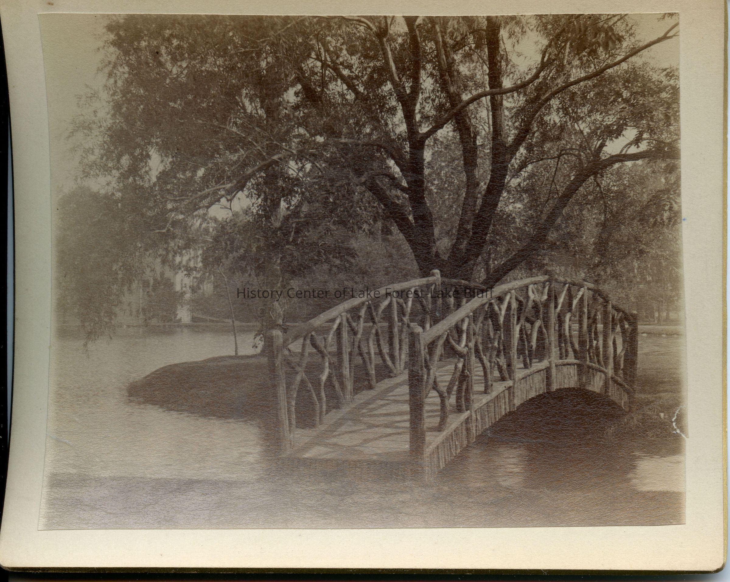 Sepia tone photograph of walking bridge over pond. House visible in the back ground. Most likely Farwell estate, Fairlawn.