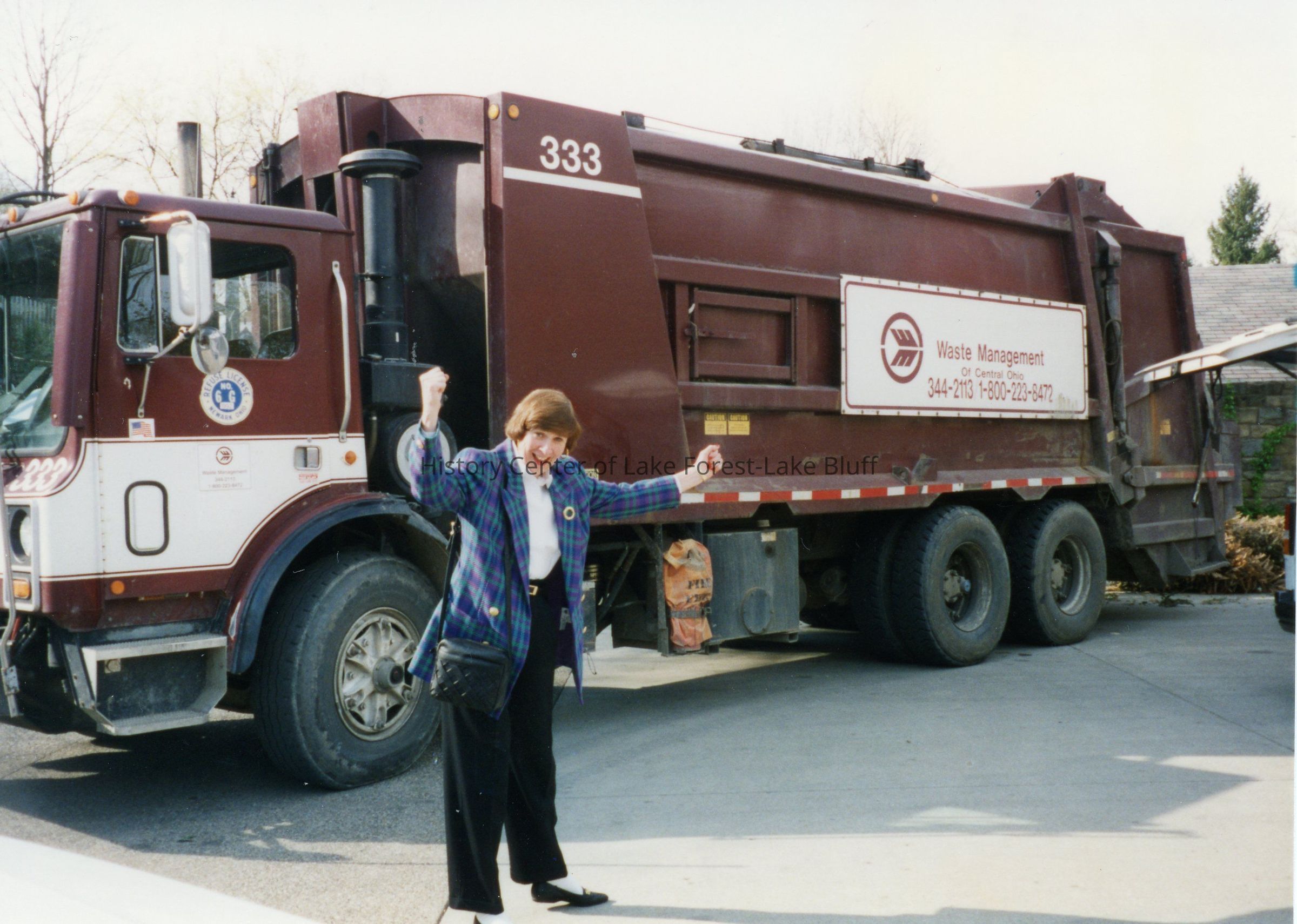 A member of the Market Square Questers poses in front of a garbage truck on a group trip to the Heisey Glass Museum in Newark, OH.Photograph Details